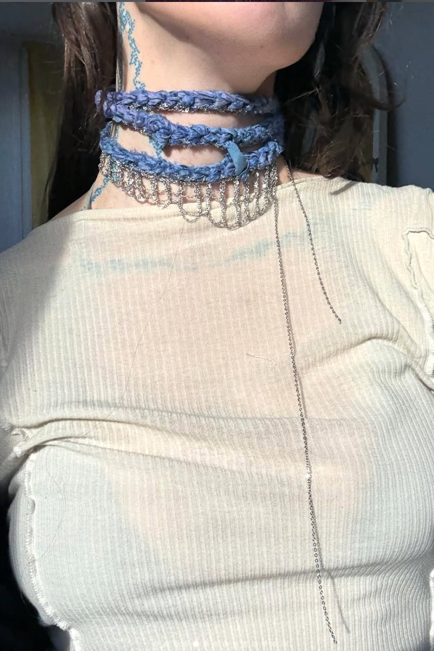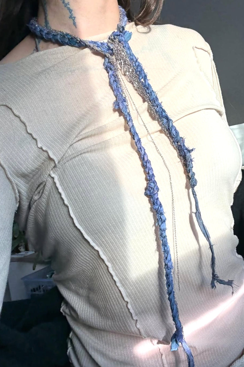 A braided silk and stainless steel chain from local brand Eudaimonic. The fabric is sourced from silk saris and has a beautiful weight and feel. Meant to be worn looped or tied around the neck, or worn on the waist as a belt.