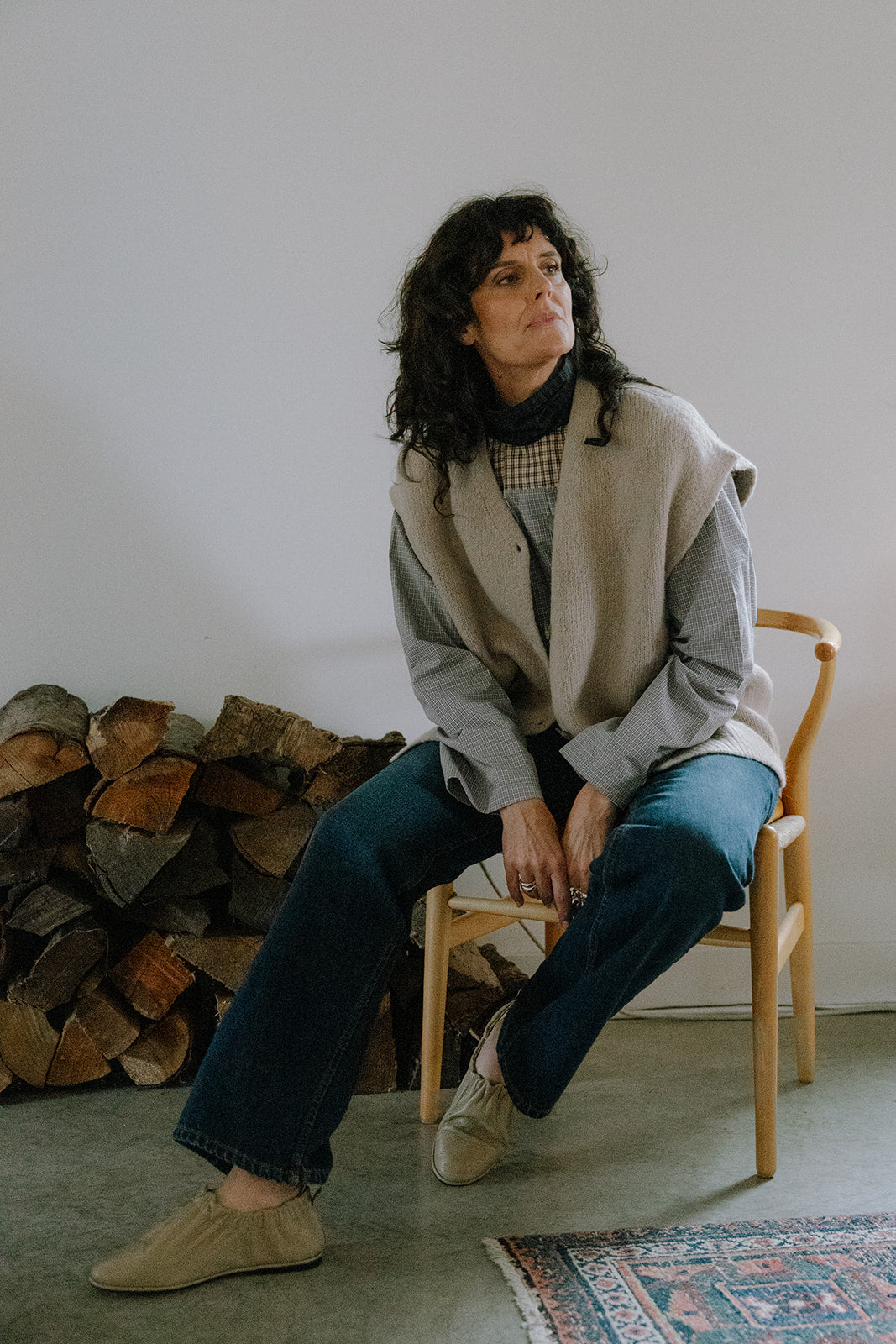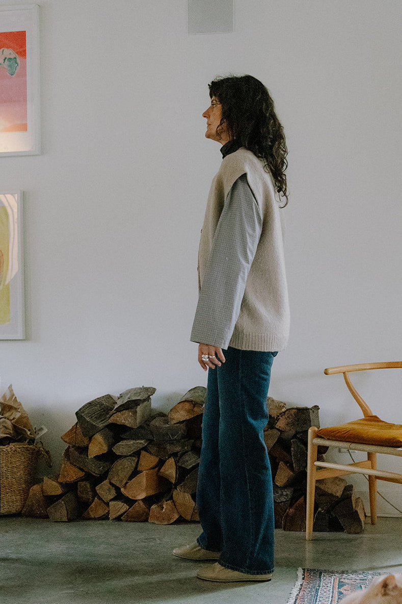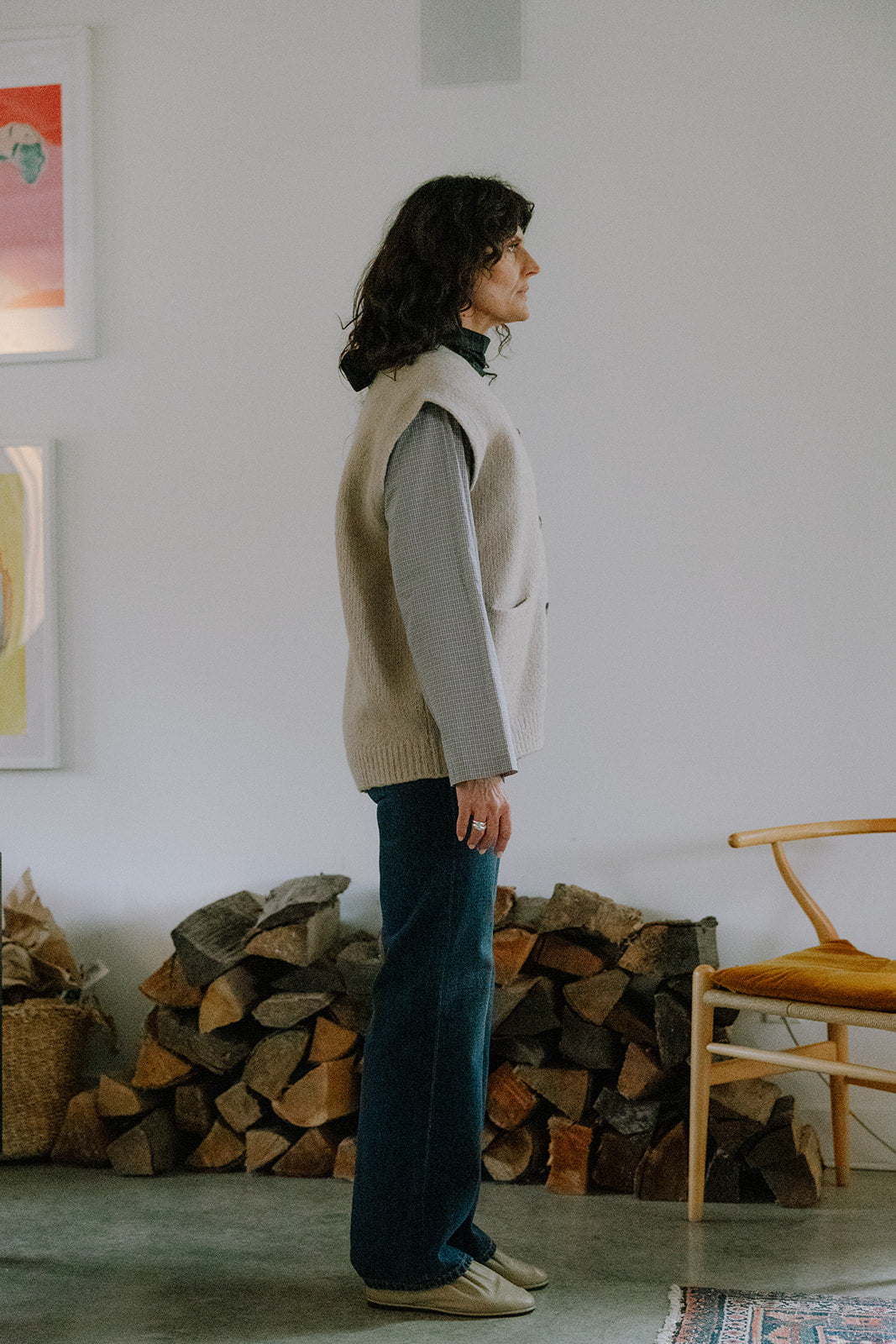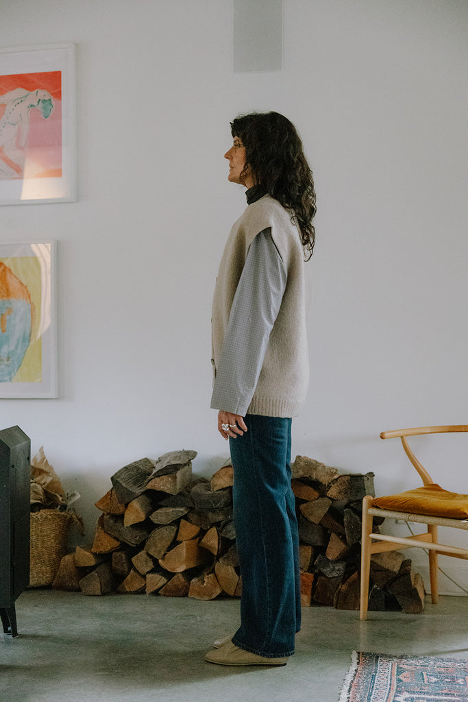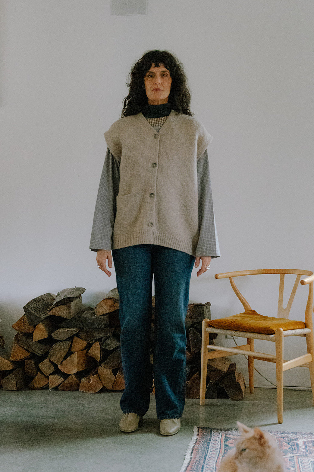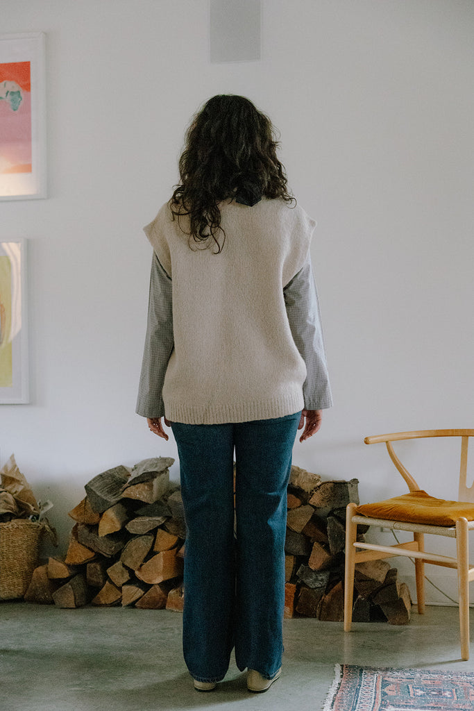 A relaxed knit vest from Lauren Manoogian with a v-neckline and button-front placket. Made in a soft blend of suri alpaca, pima cotton, and fine merino wool, it features a single pocket, subtle ribbed hem, and clean construction.