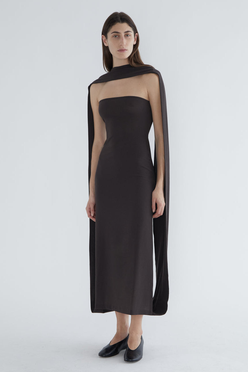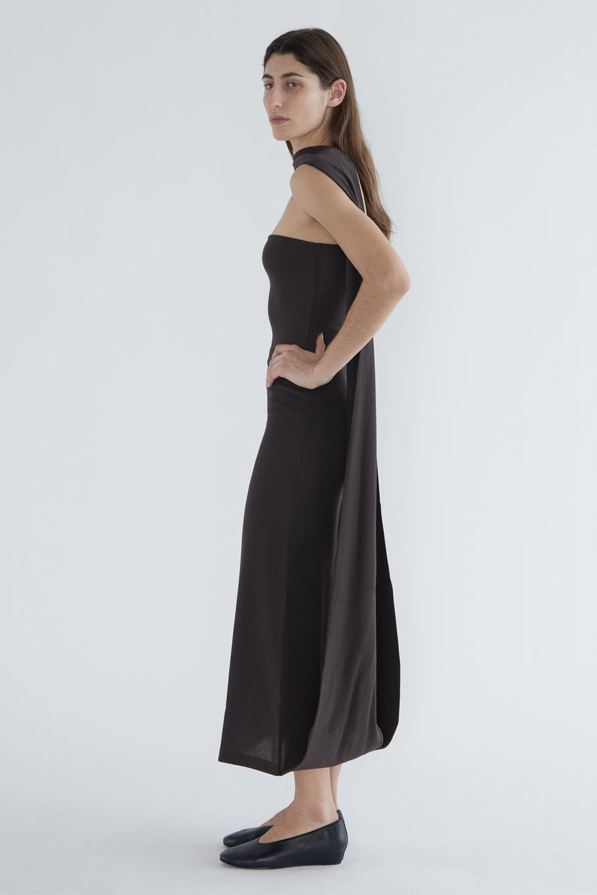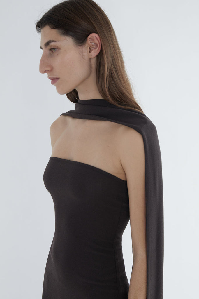 Fitted long dress with a folded front that creates a high neckline. Made of stretchy wool.