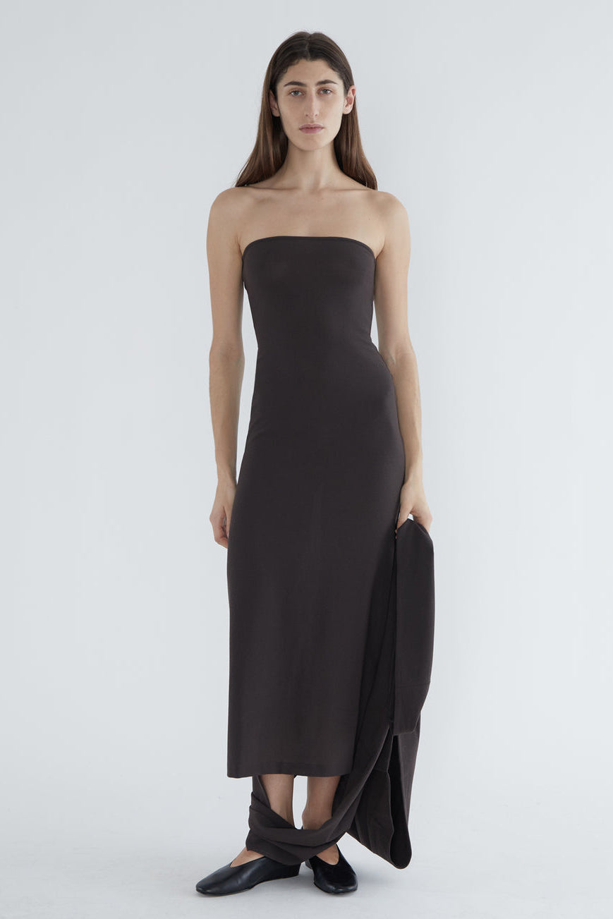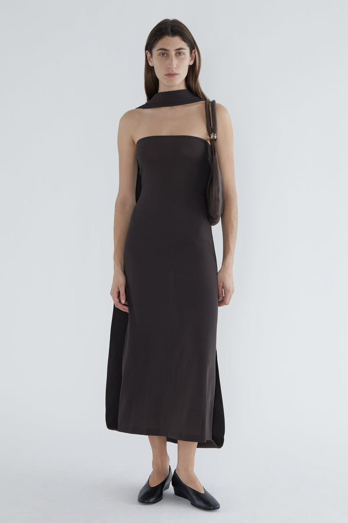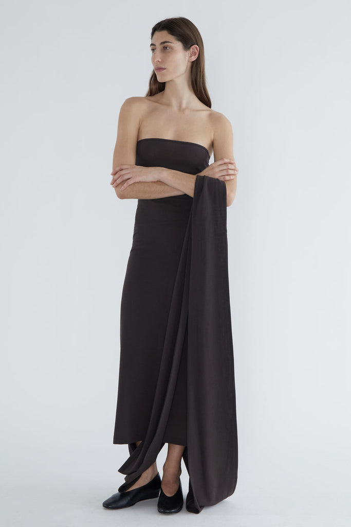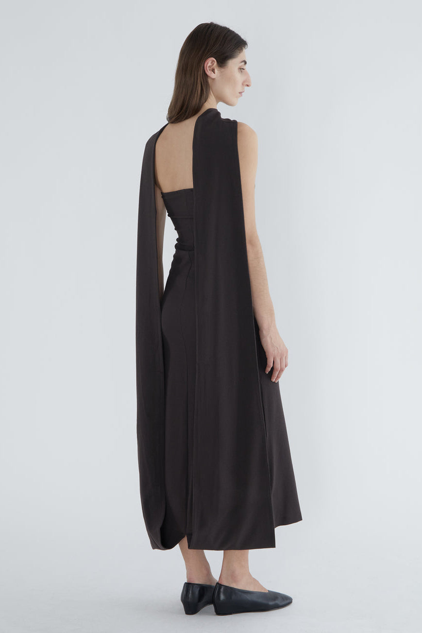 Fitted long dress with a folded front that creates a high neckline. Made of stretchy wool.
