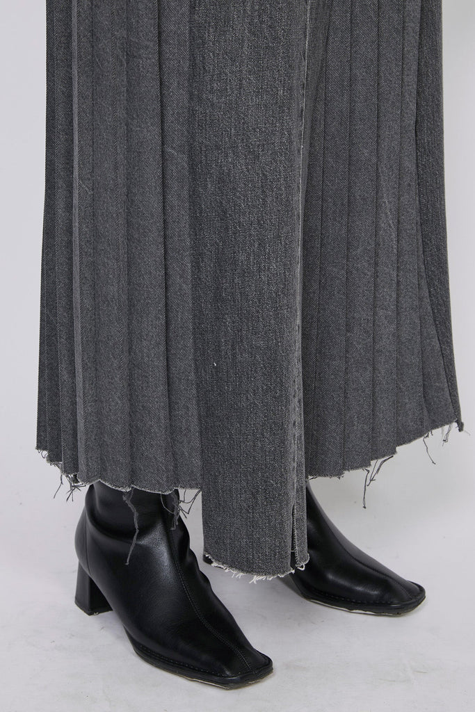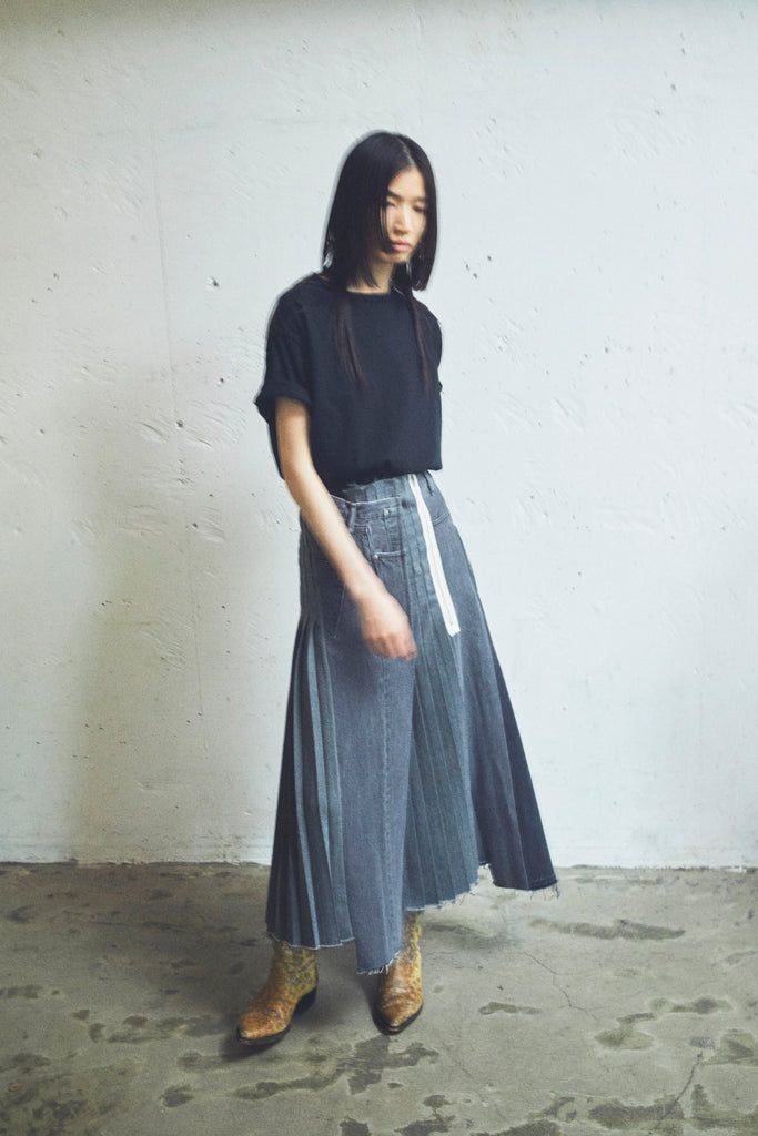 A remade pleated skirt from Japanese brand, Kuro, using pleats made of 100% shape-retaining cotton. Denim pants are repurposed and disassembled for the structure, and pleats are inserted to create a full shape. A craftsman sews all the individual pieces and puts them together in the Kuro atelier. Three pairs of pants are disassembled based on vivid, deep-colored denim, and the transitions that make use of the vertical lines are unified in the same color scheme to keep the tone down.