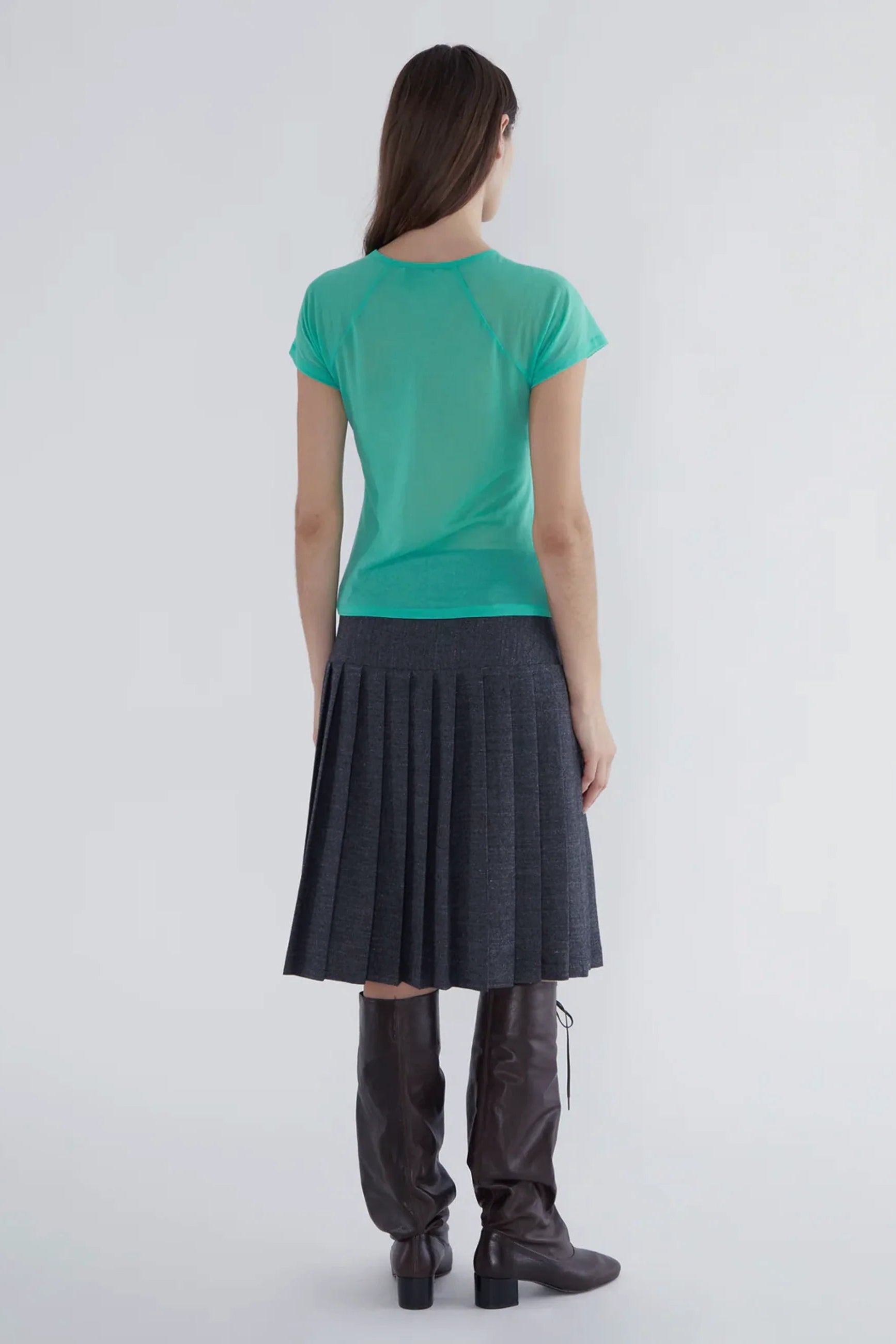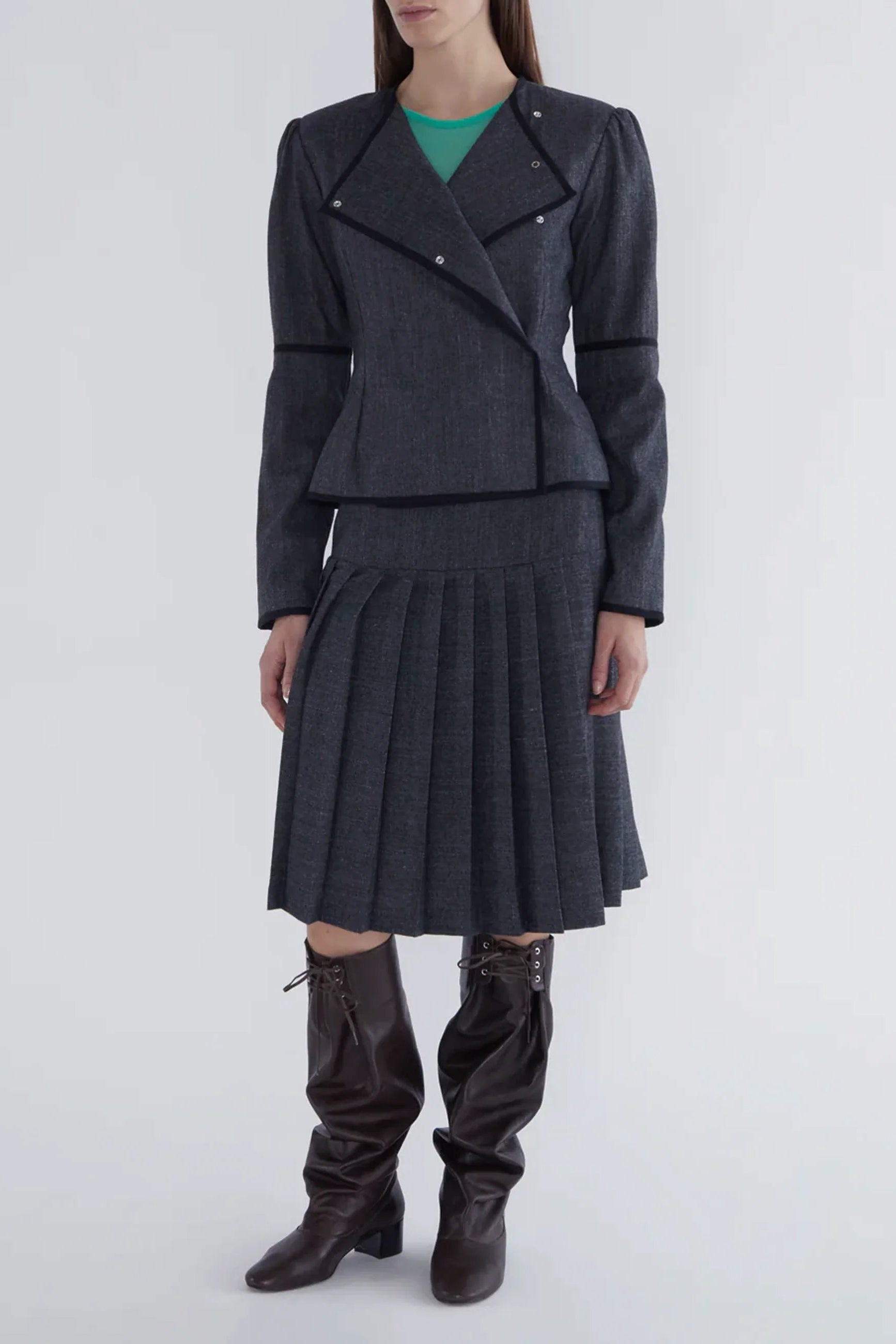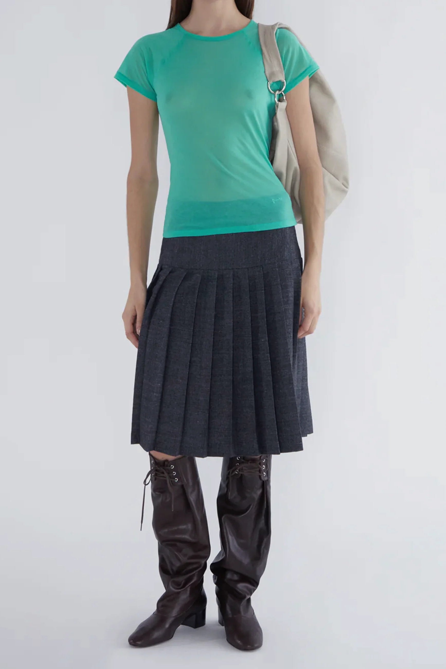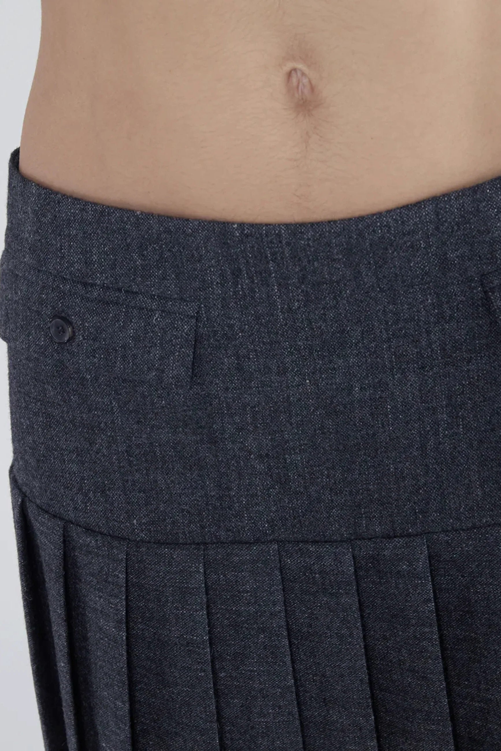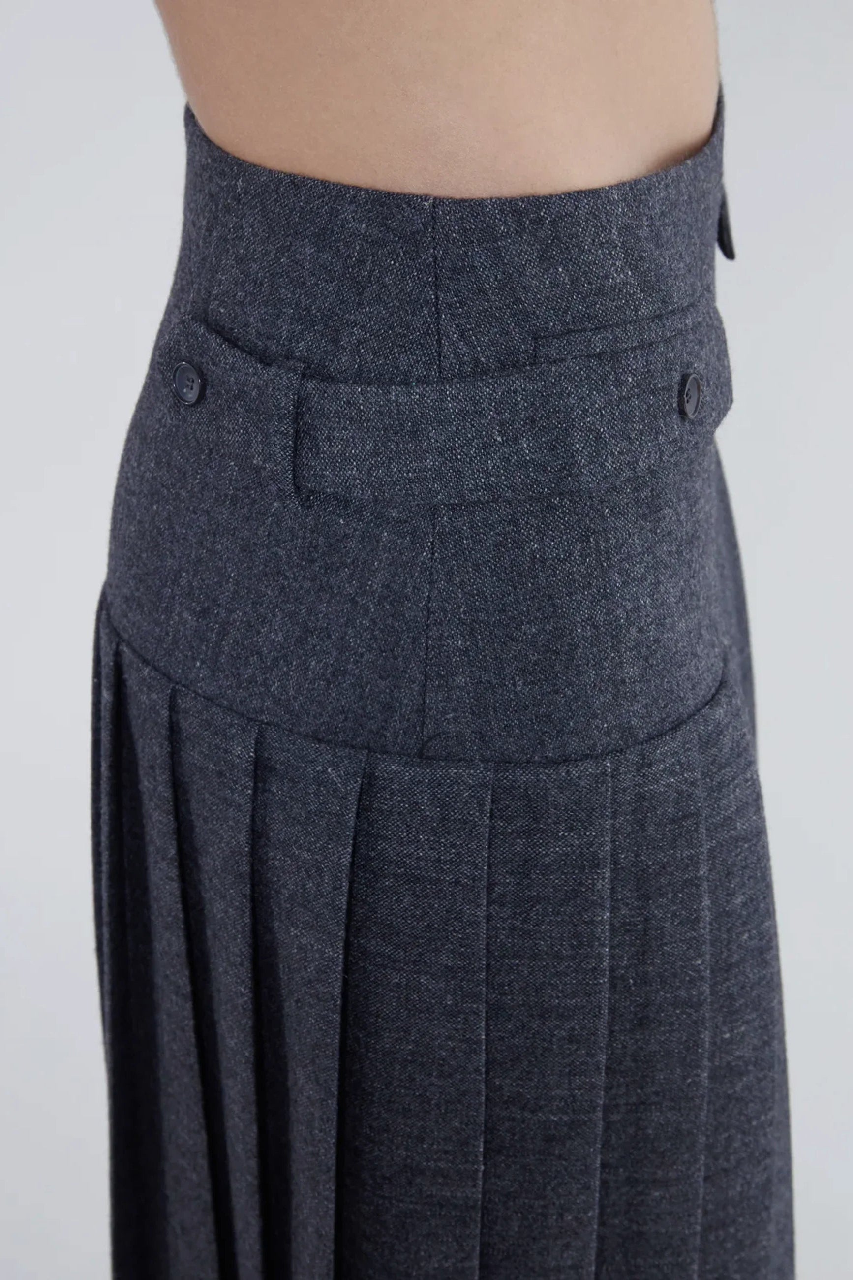 A midi length pleated skirt from Paloma Wool with pleats starting at mid-hip. The waistband features two flap pockets that extend toward the back. Constructed from a medium-thick wool fabric.