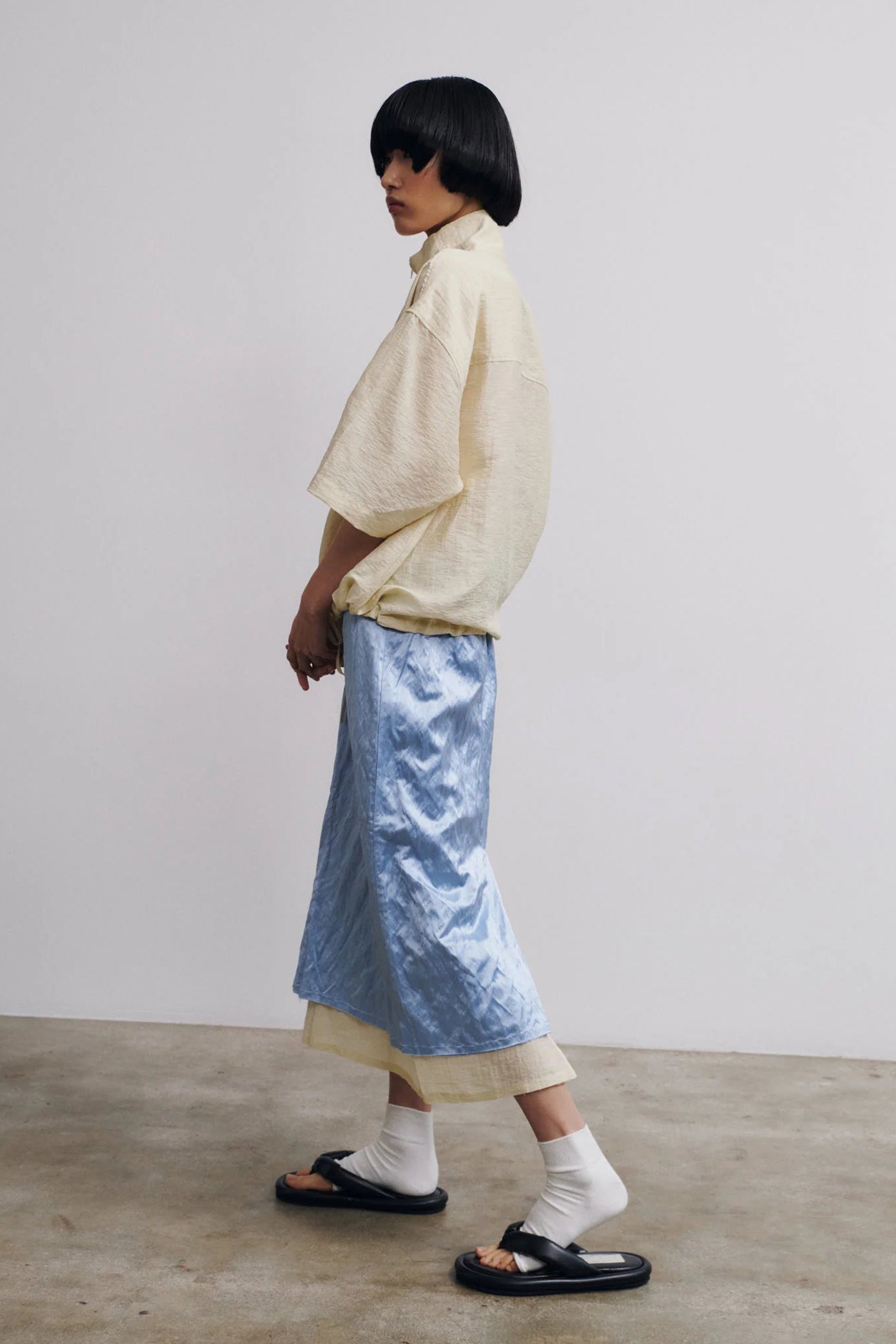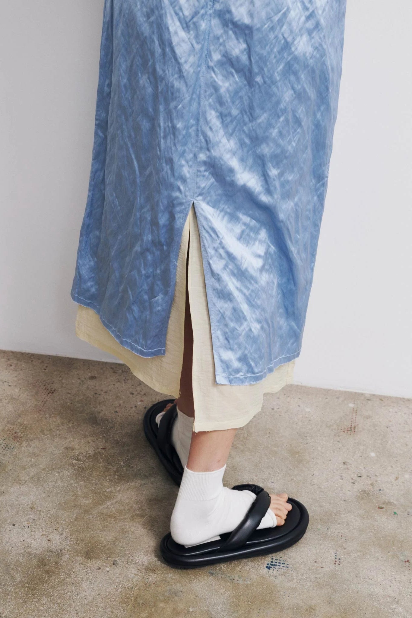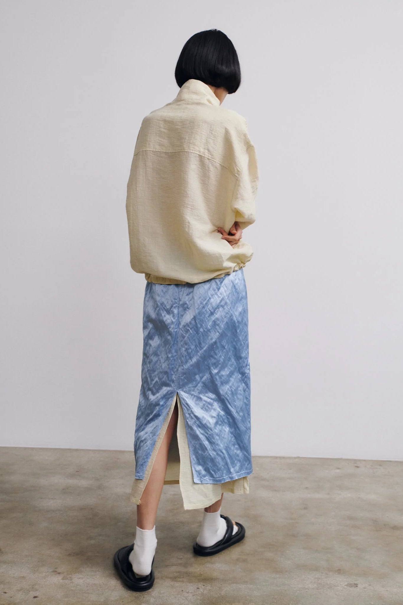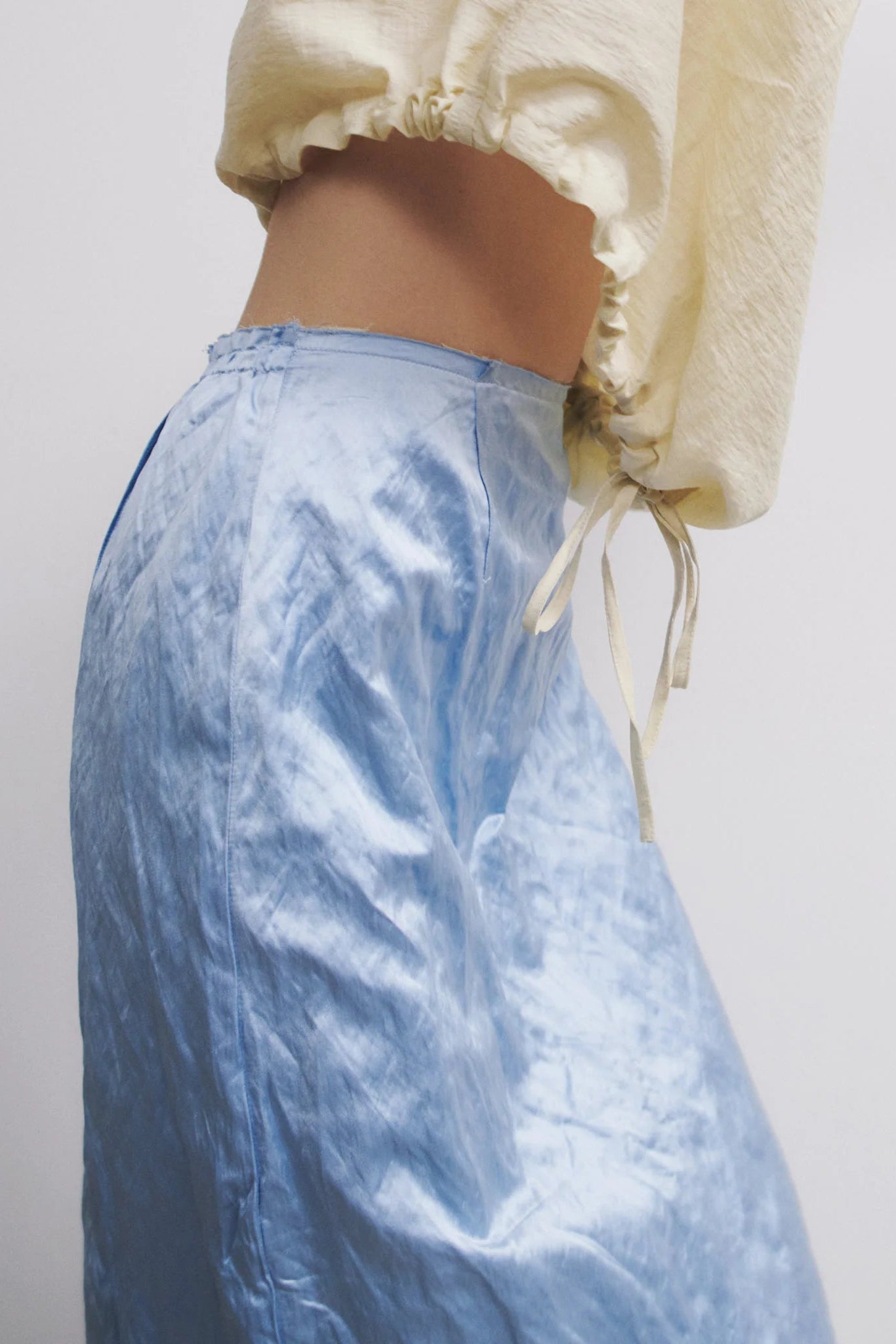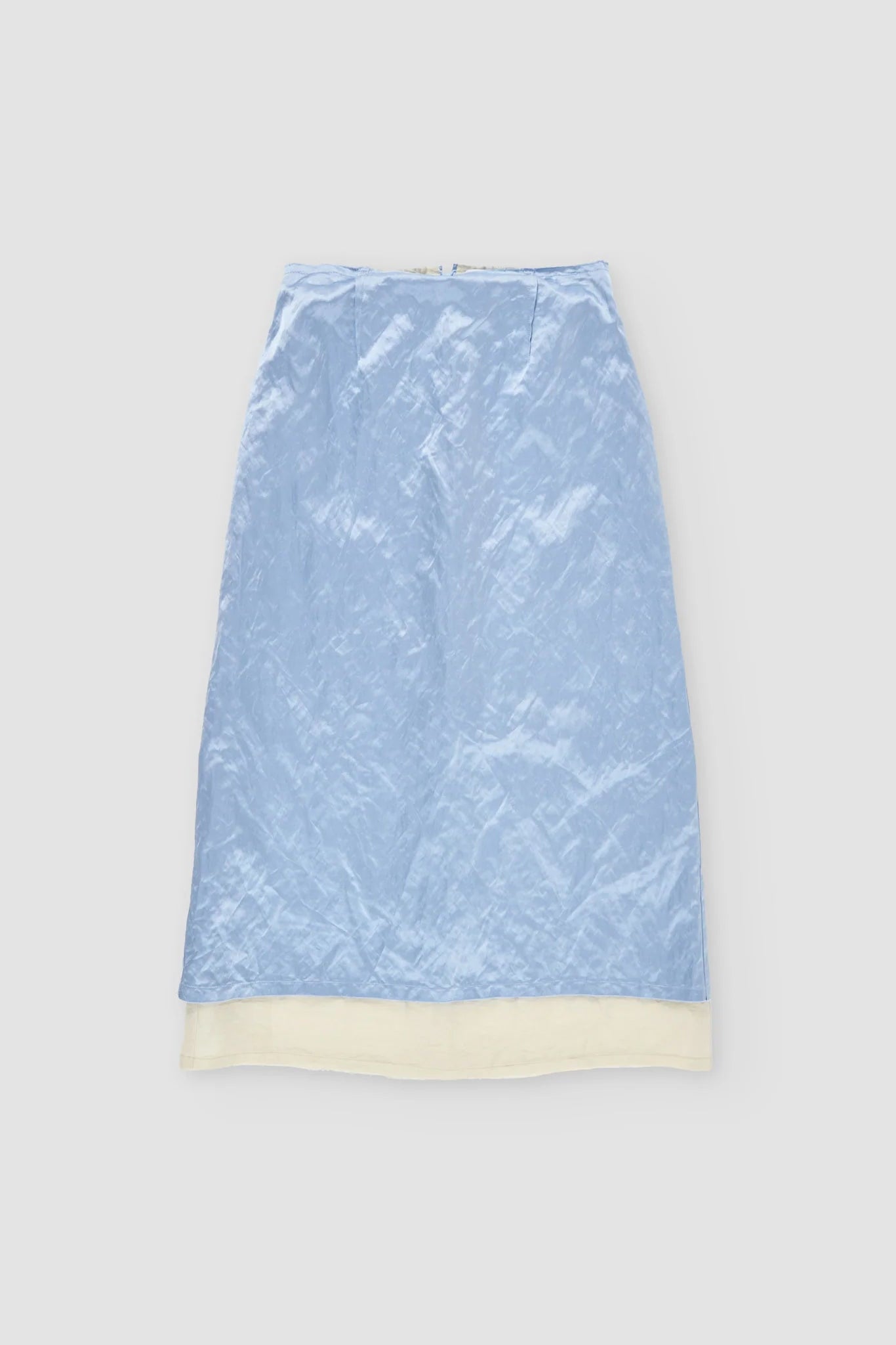The Muishiki Skirt by Rus. A layered midi skirt crafted from satin with metallic fibers, giving it a subtle lived-in texture, paired with a textured linen inner layer. Features a frayed waist and hem, exposed darts, and a back split. The outer layer sits slightly shorter than the inner layer, creating a layered effect.