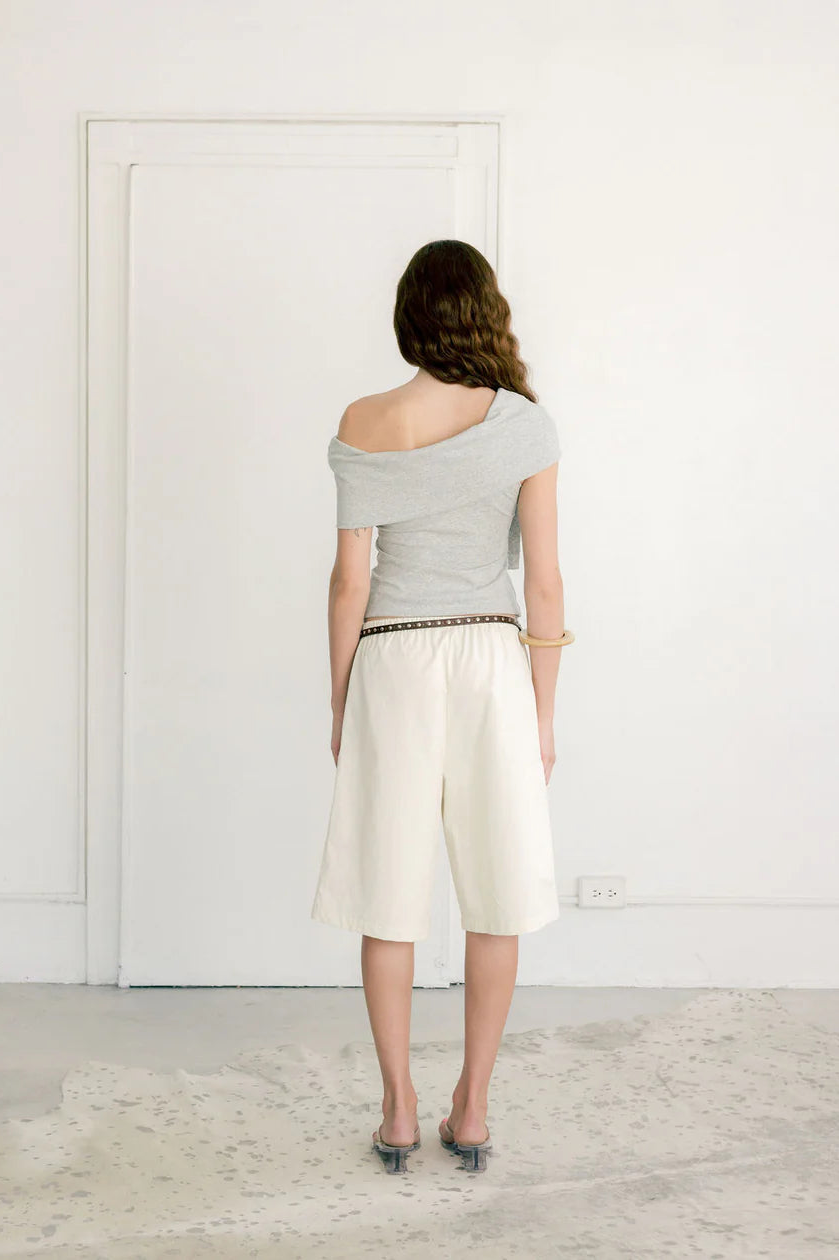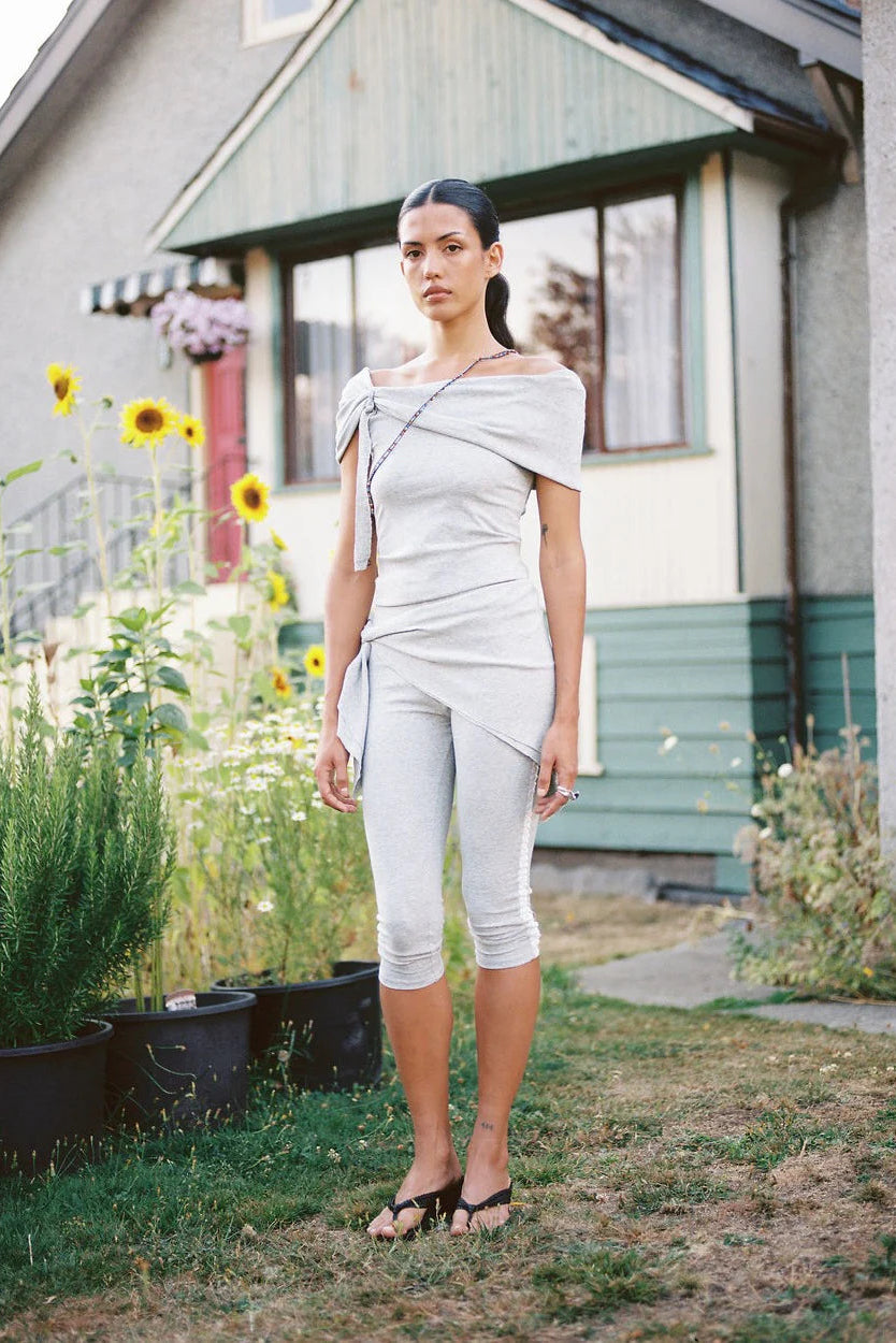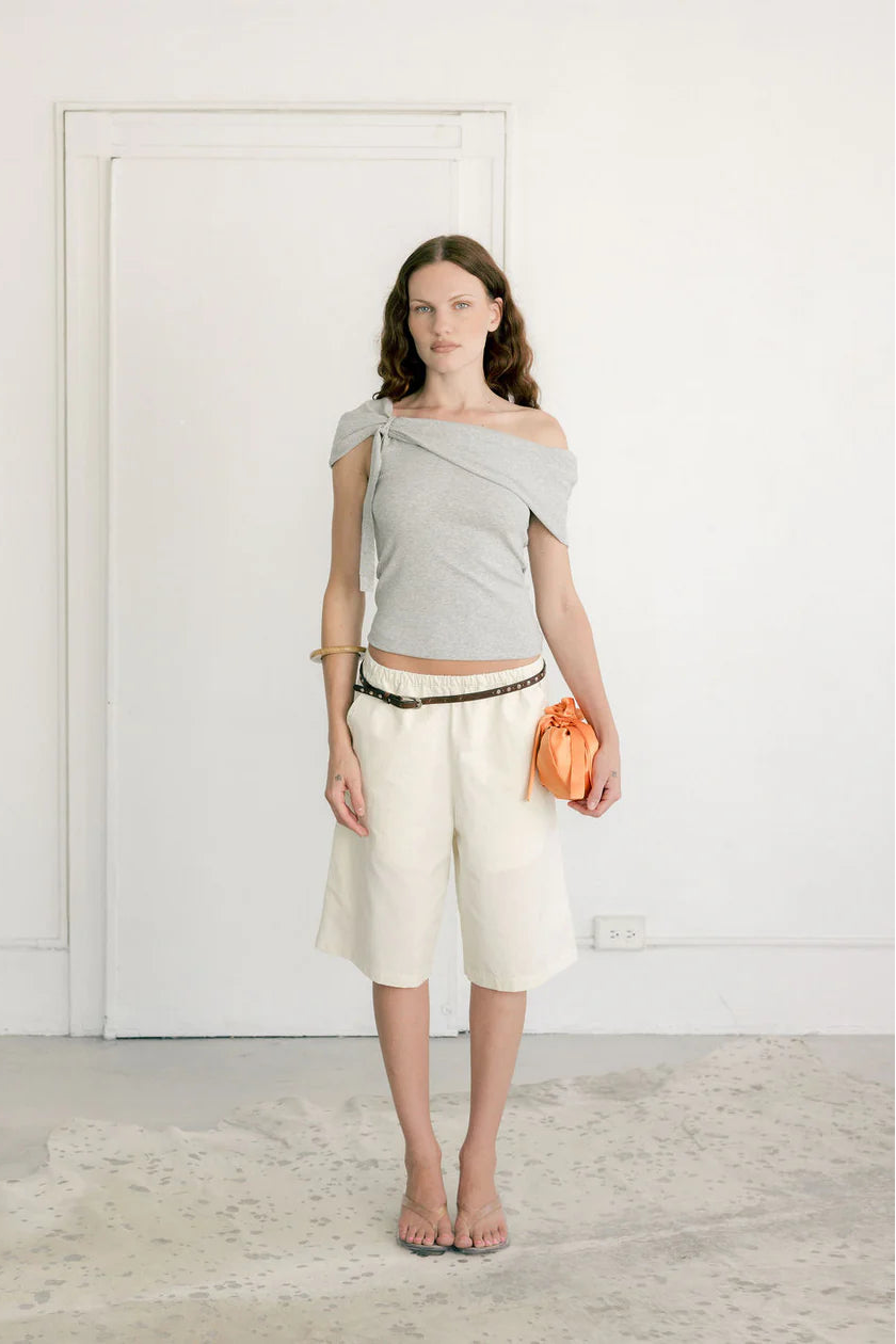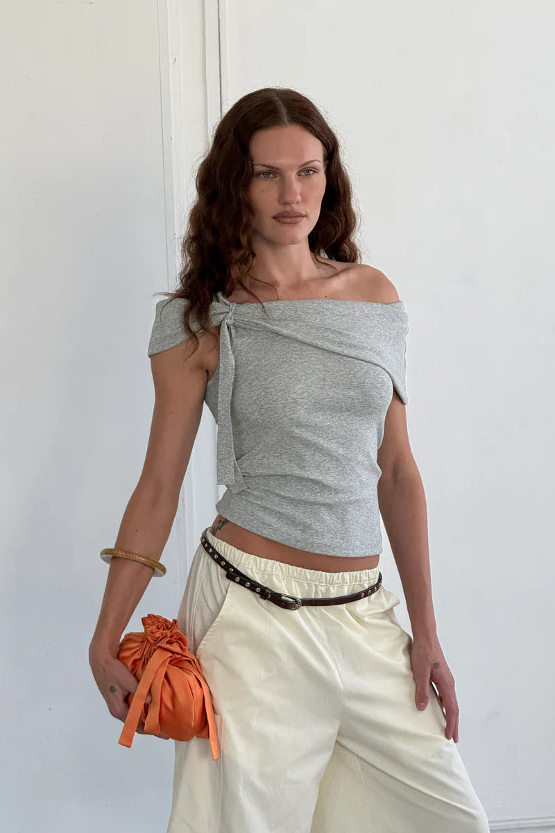 The Celine Top by A Bronze Age. An off the shoulder top with removable tie detail. Made from soft, stretchy cotton
