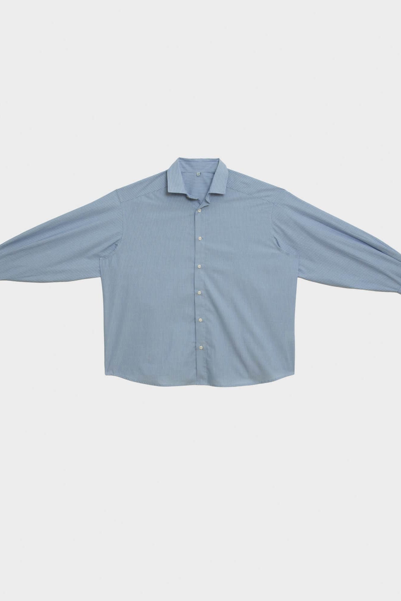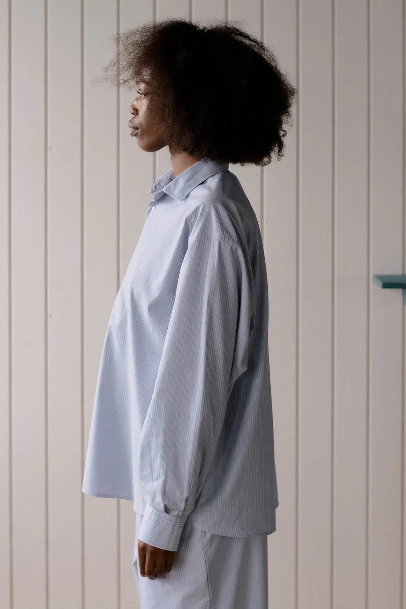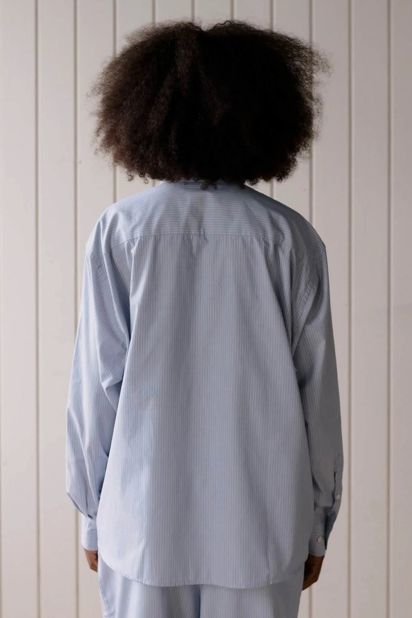 Organic cotton poplin shirt from Baserange. Button-up closure with a curved hem, two buttons at cuff and button at sleeve placket. Features a wide cut, with a back yoke.