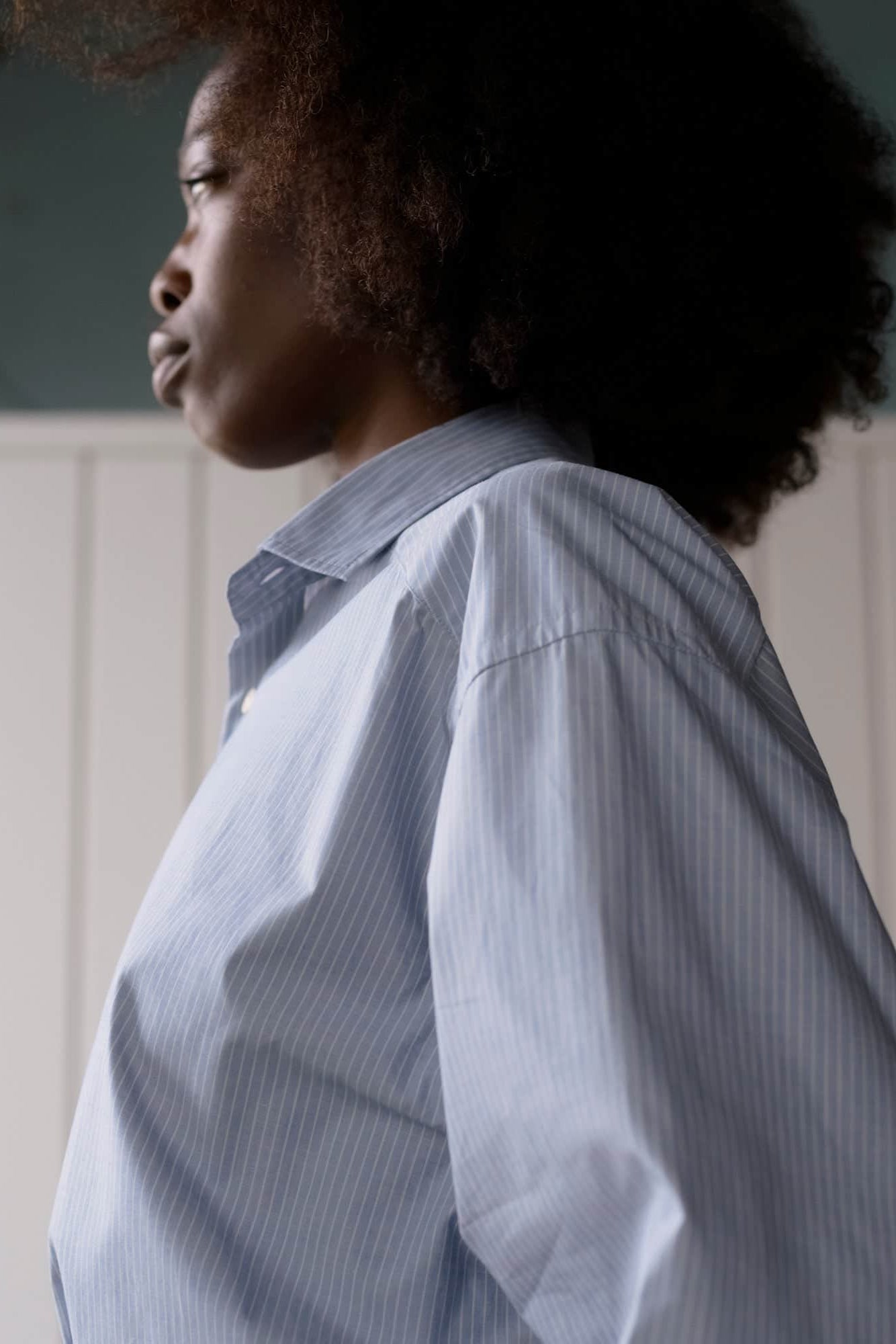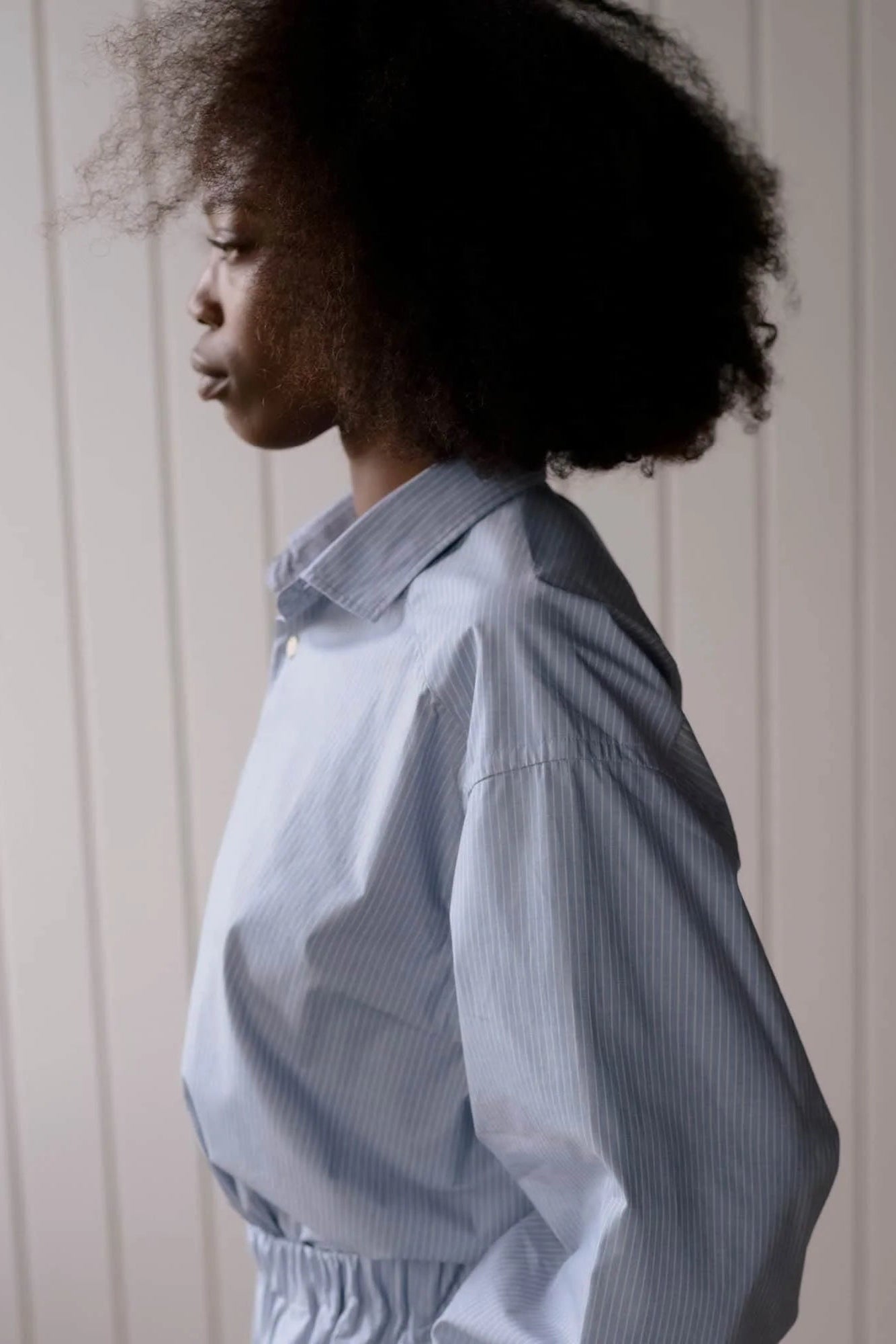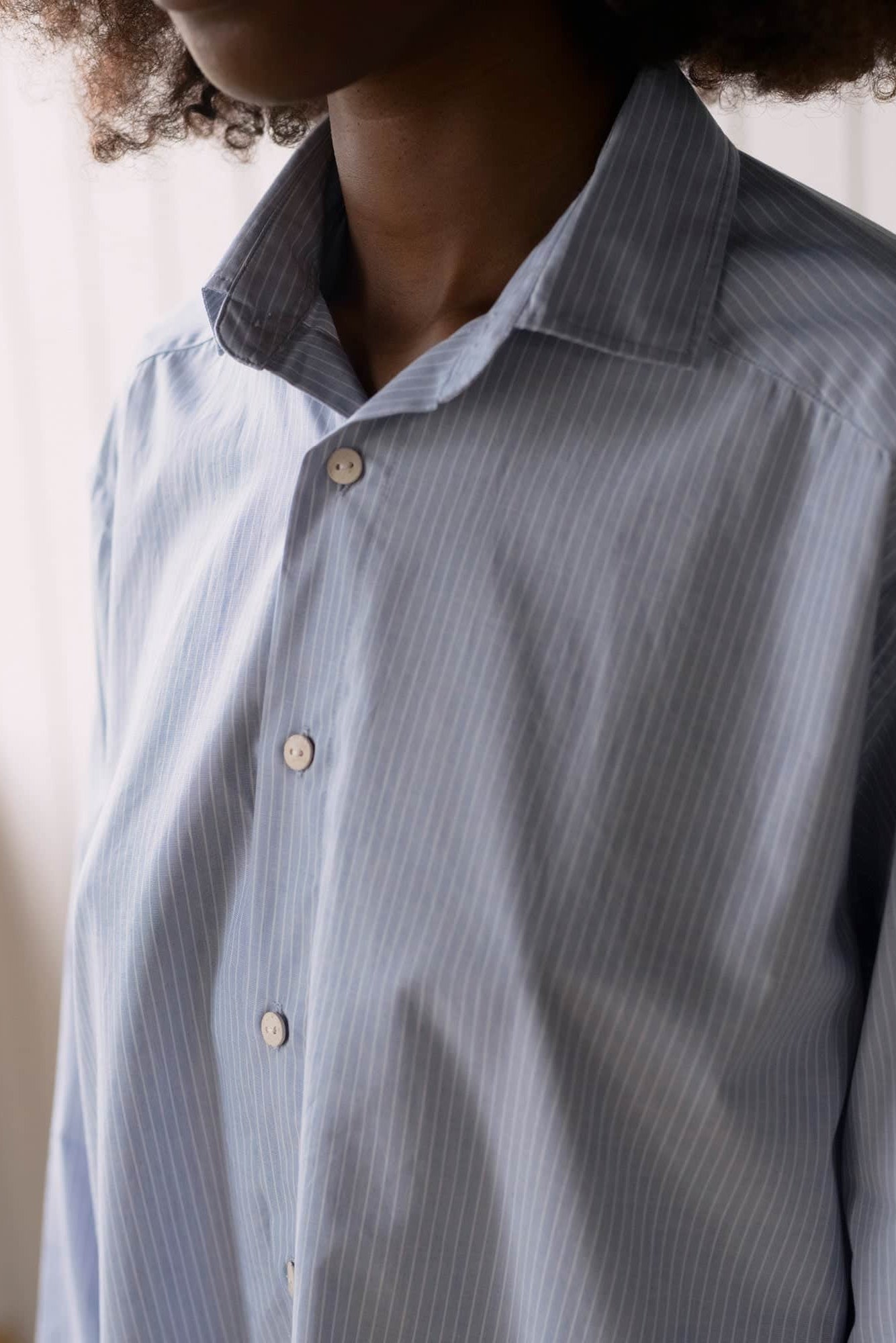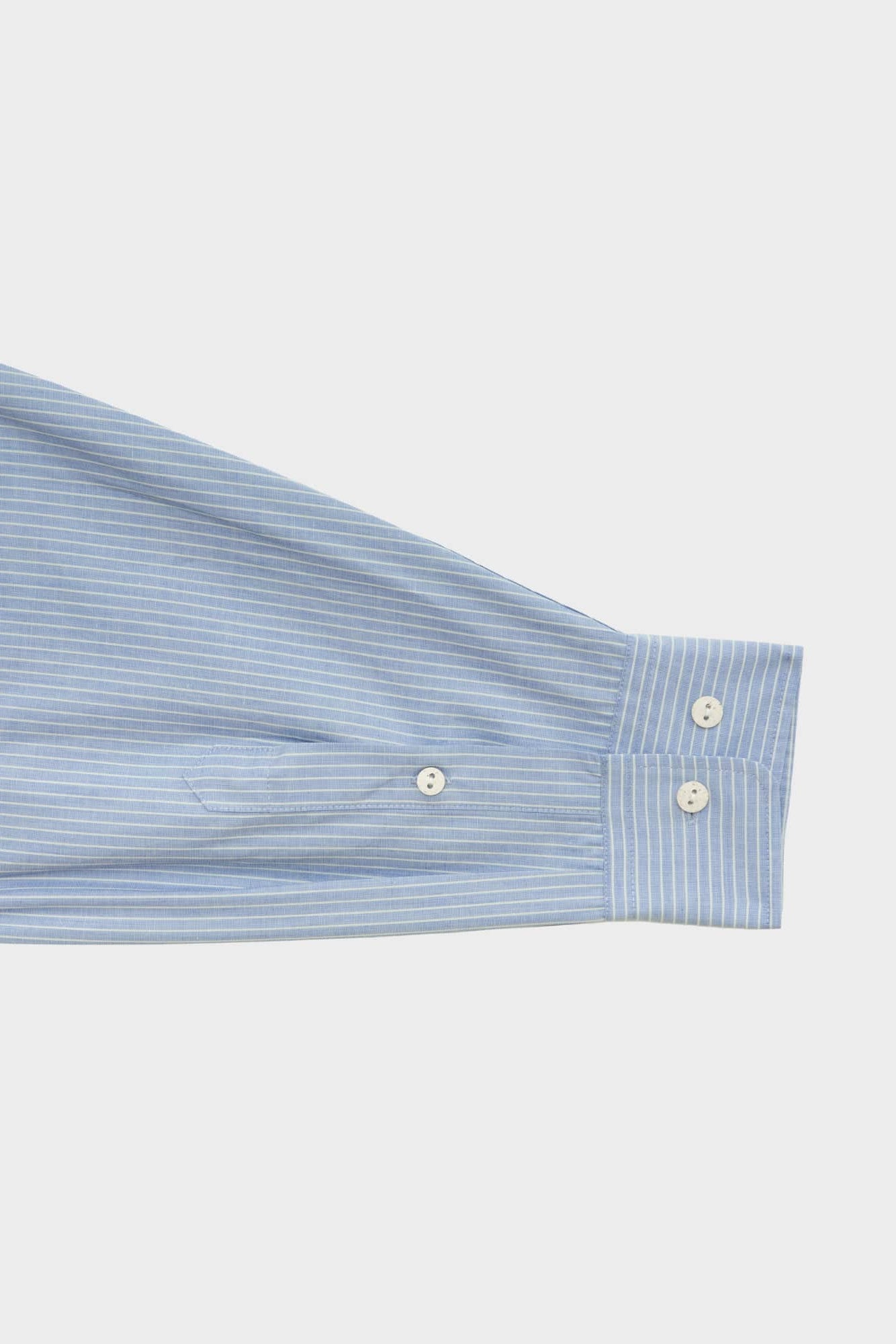 Organic cotton poplin shirt from Baserange. Button-up closure with a curved hem, two buttons at cuff and button at sleeve placket. Features a wide cut, with a back yoke.