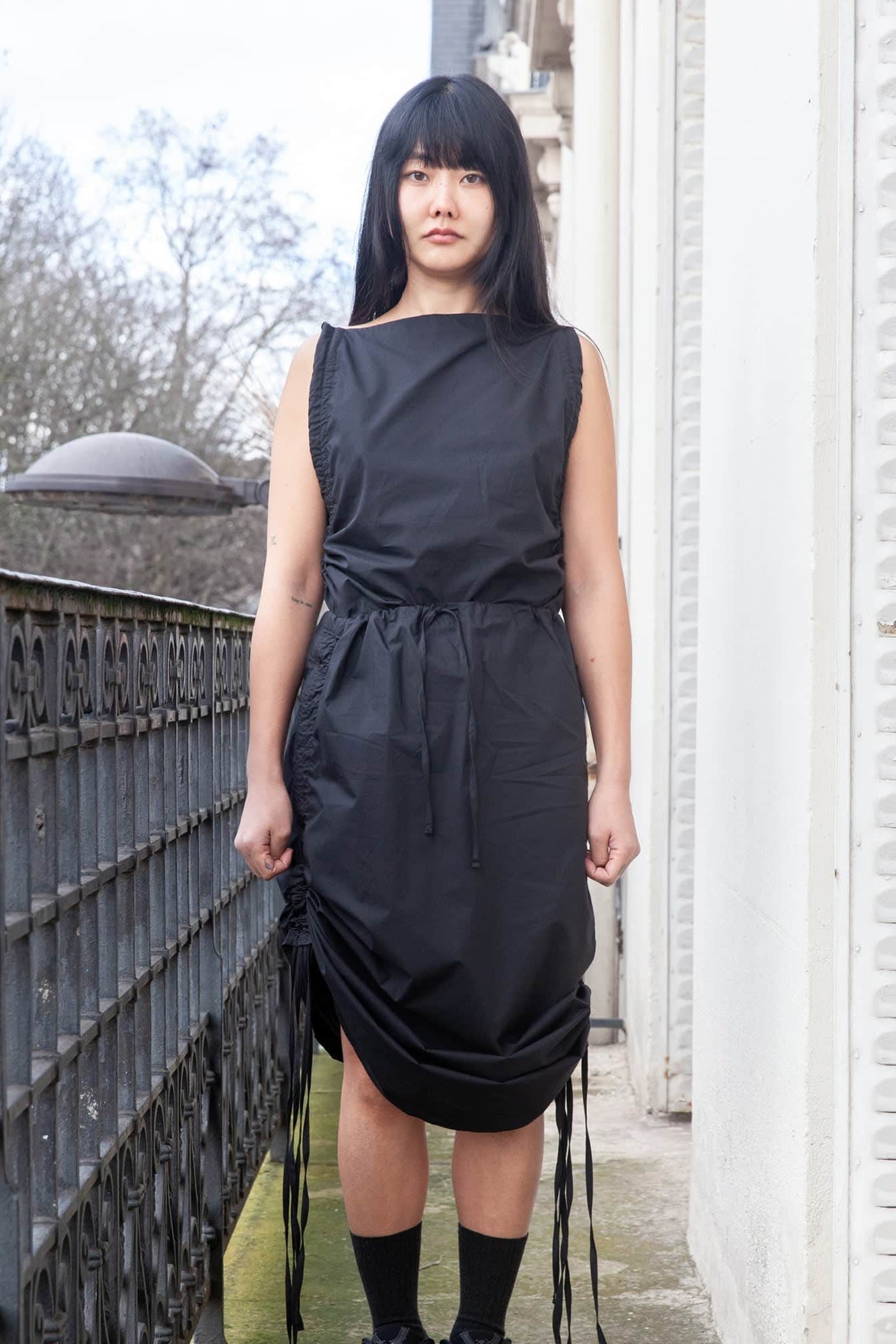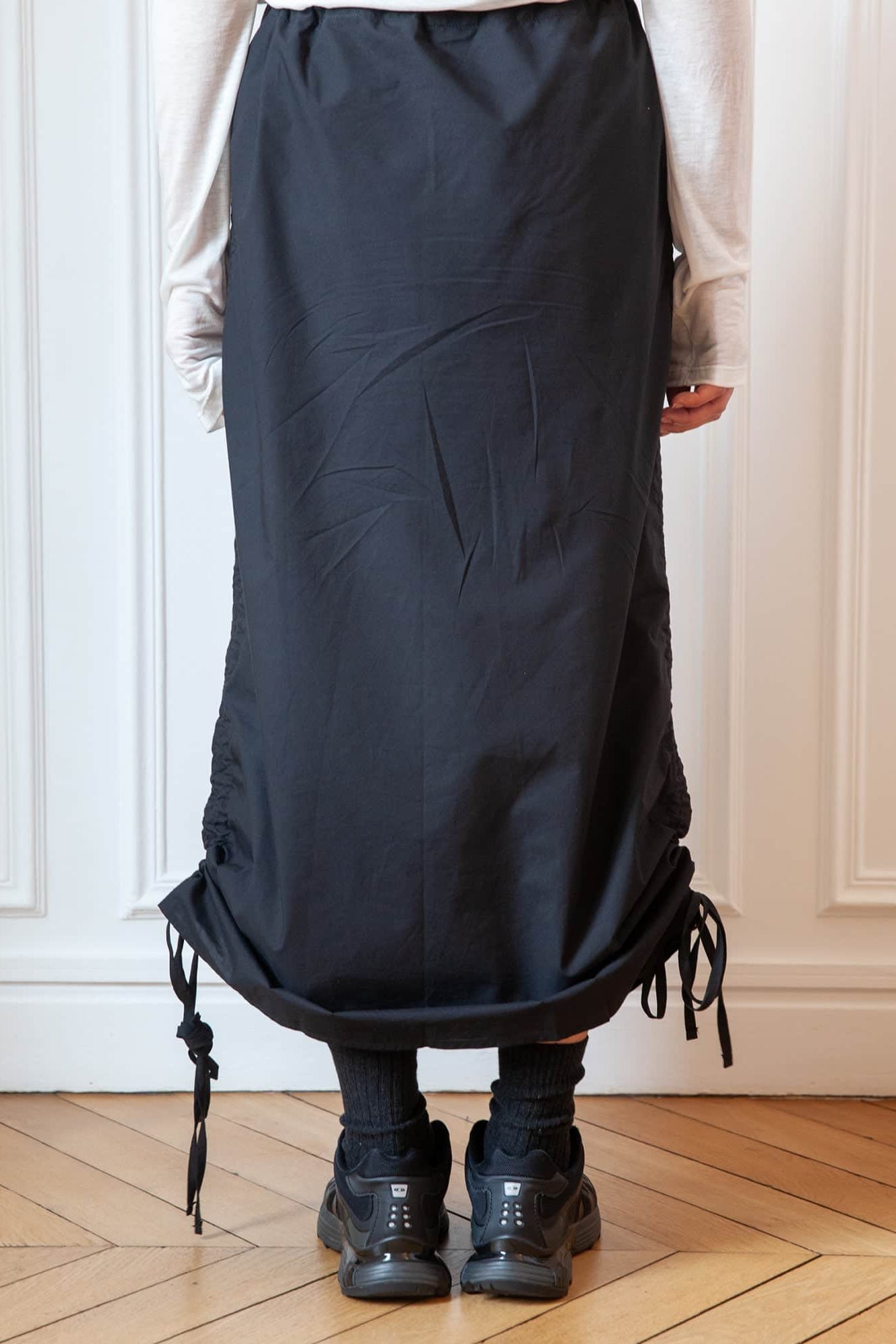 Organic cotton poplin skirt from Baserange. Features drawstring at sides and waist, can be worn multiple ways.