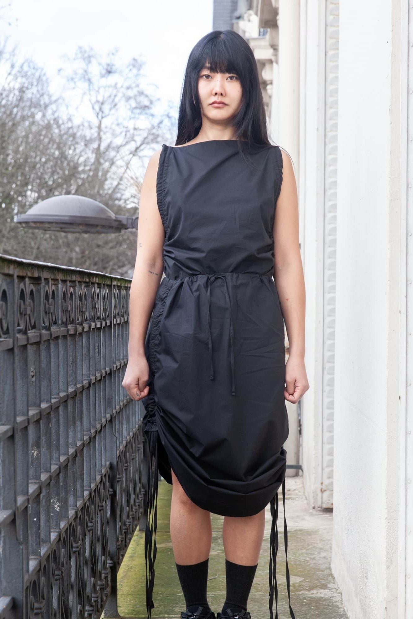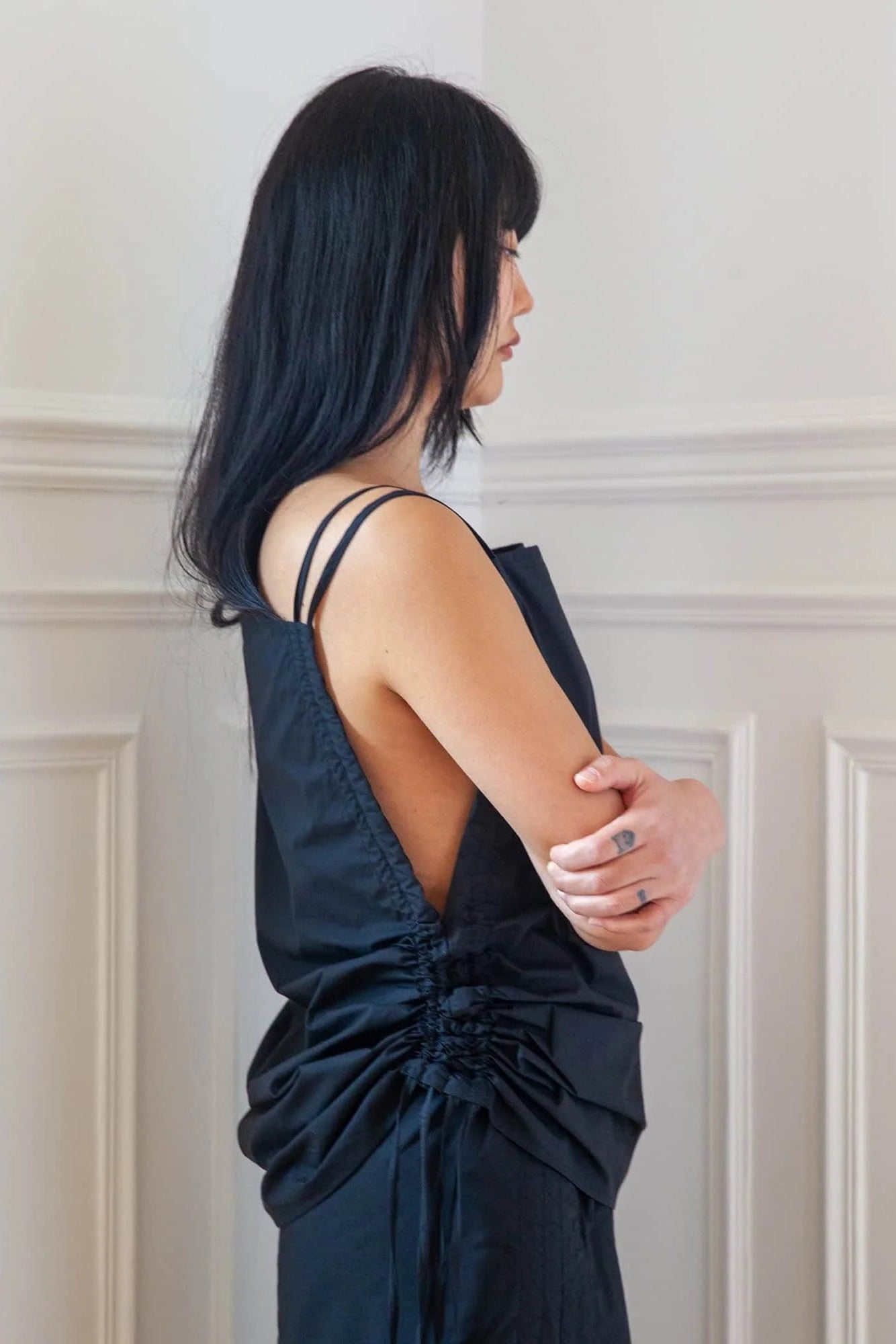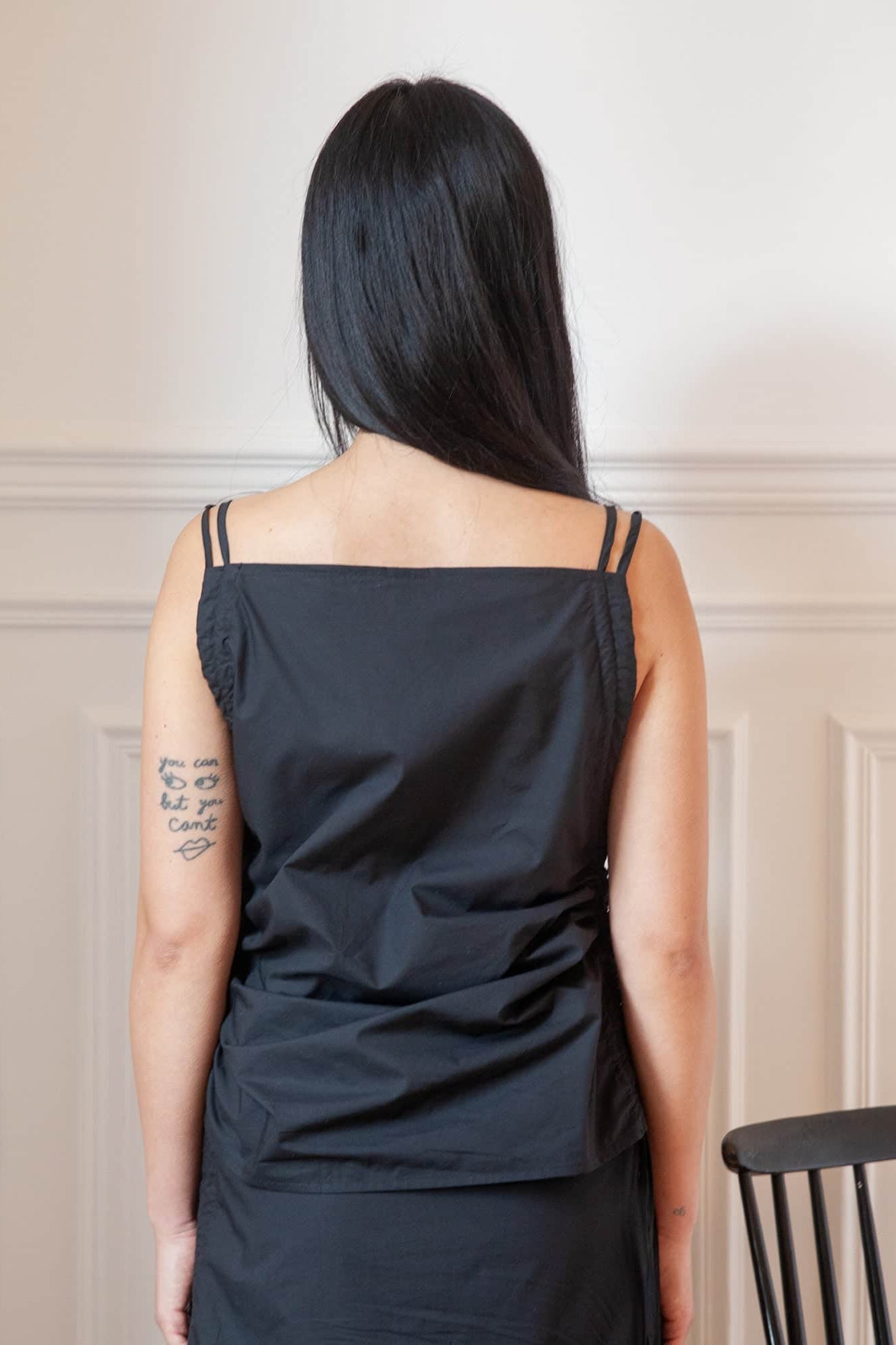 Organic cotton poplin top from Baserange. Features a straight neckline, drawstring straps. Can be worn multiple ways.