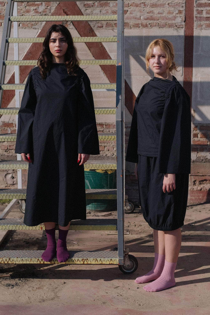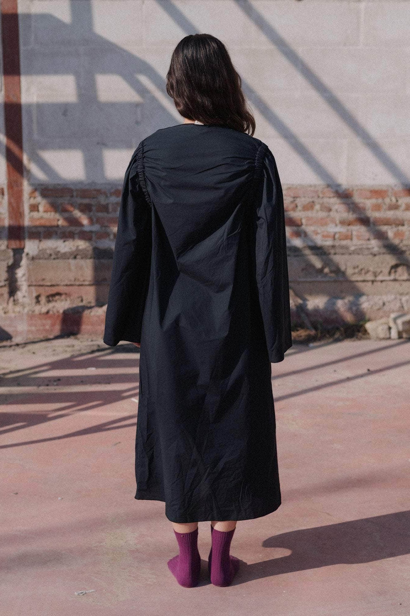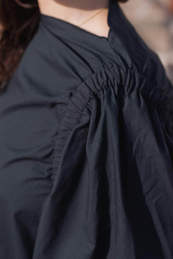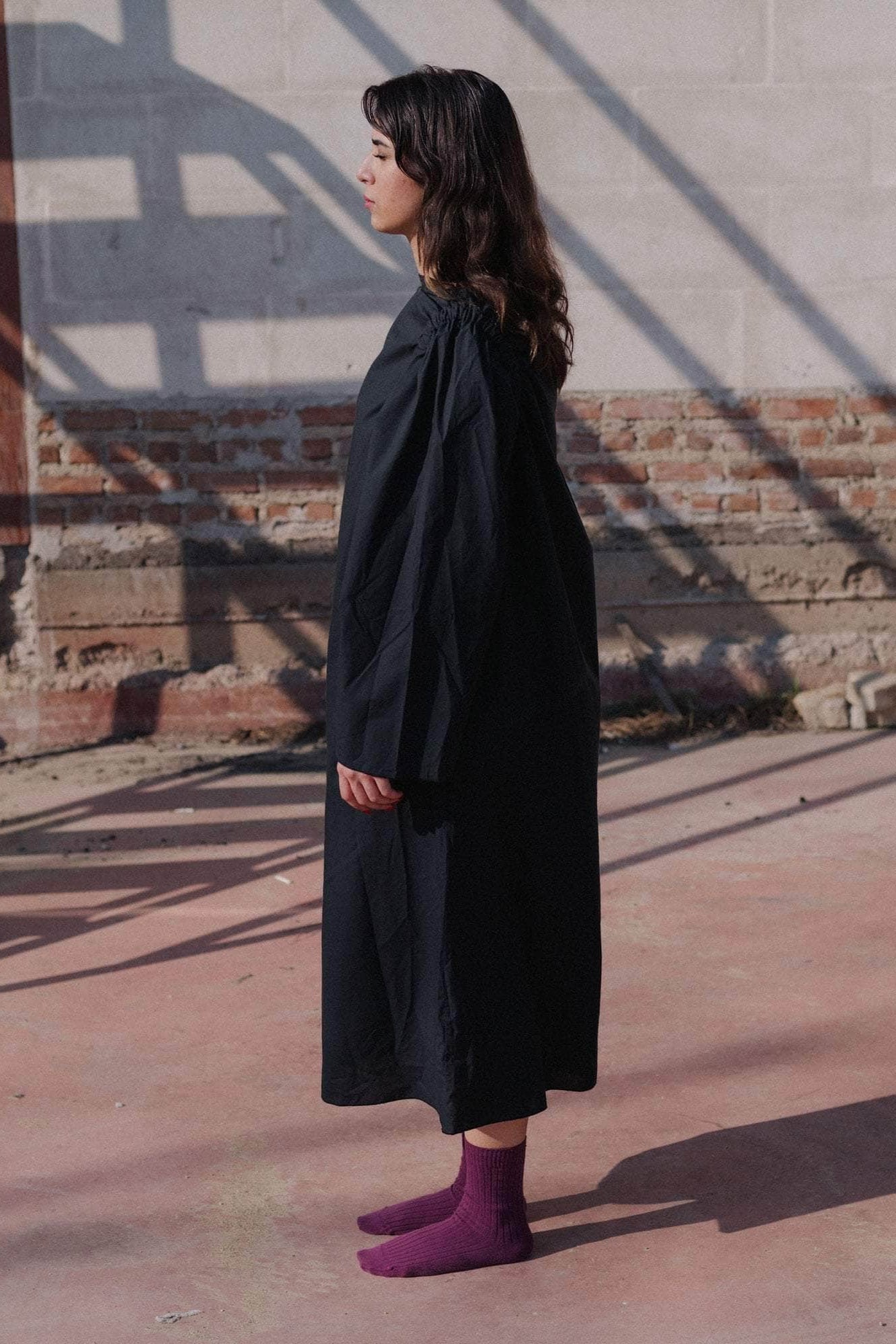 An organic cotton poplin dress from Baserange. Features a boat neckline, and elastic gathers at armholes.