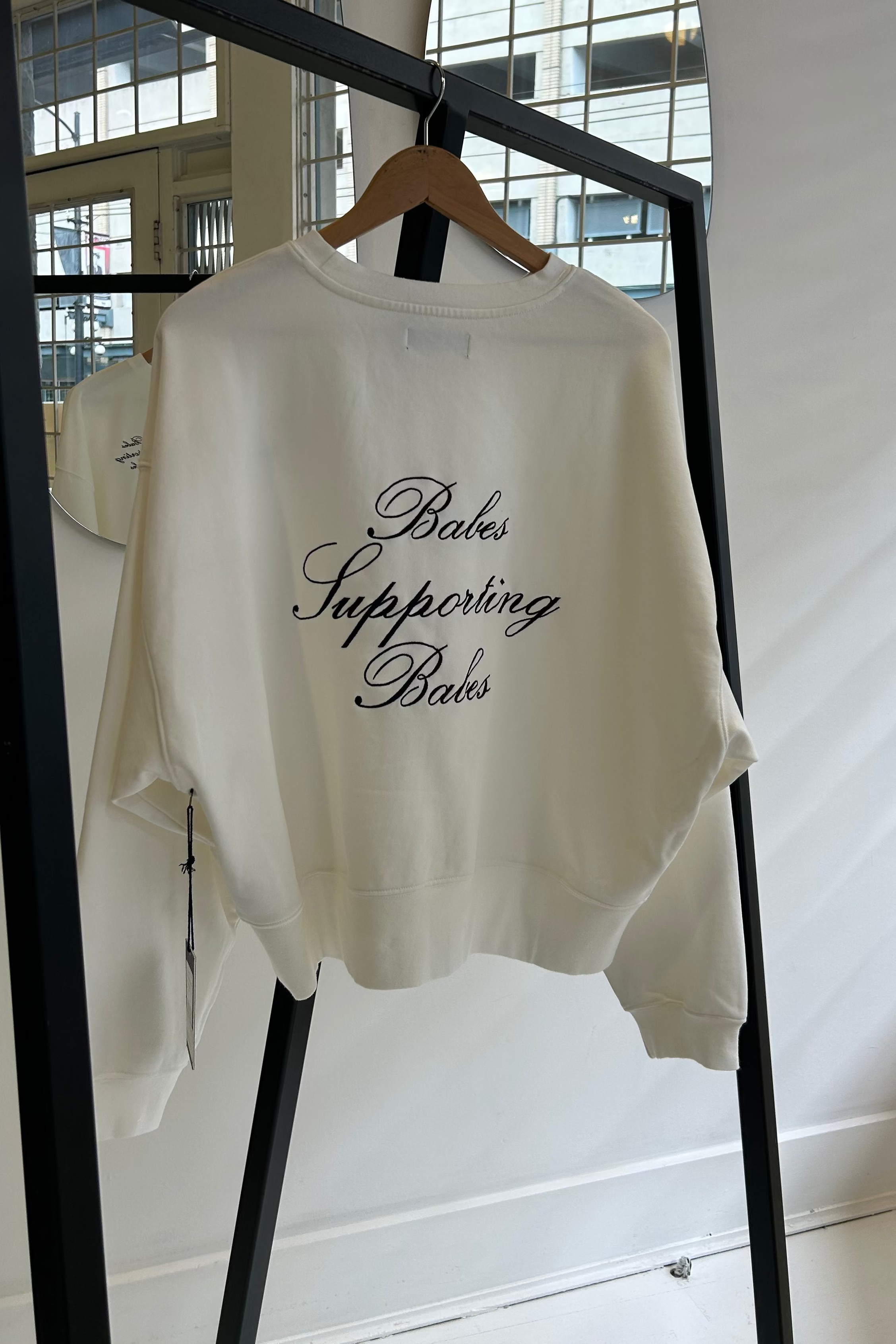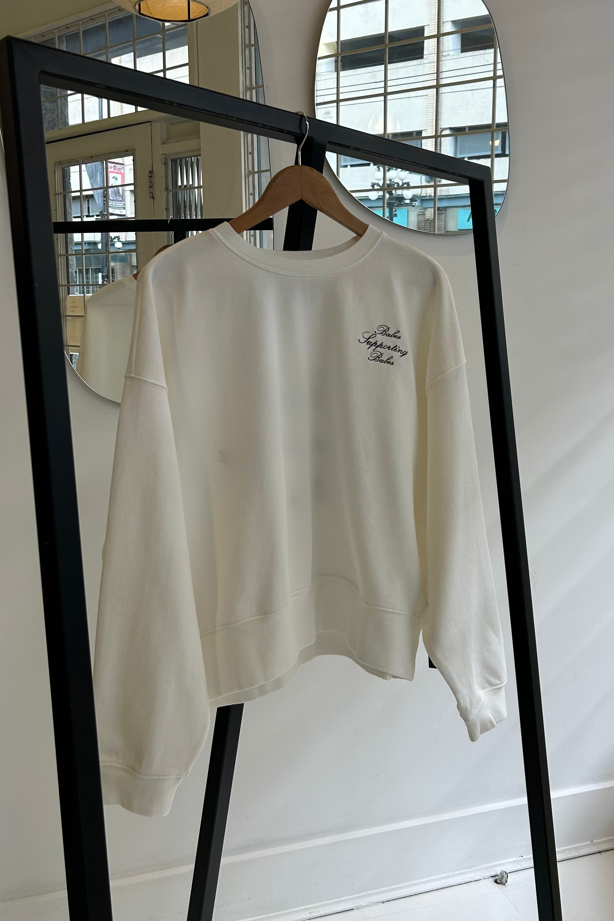 A cotton crewneck with script on front and back. Raglan cut with a subtle balloon sleeve.