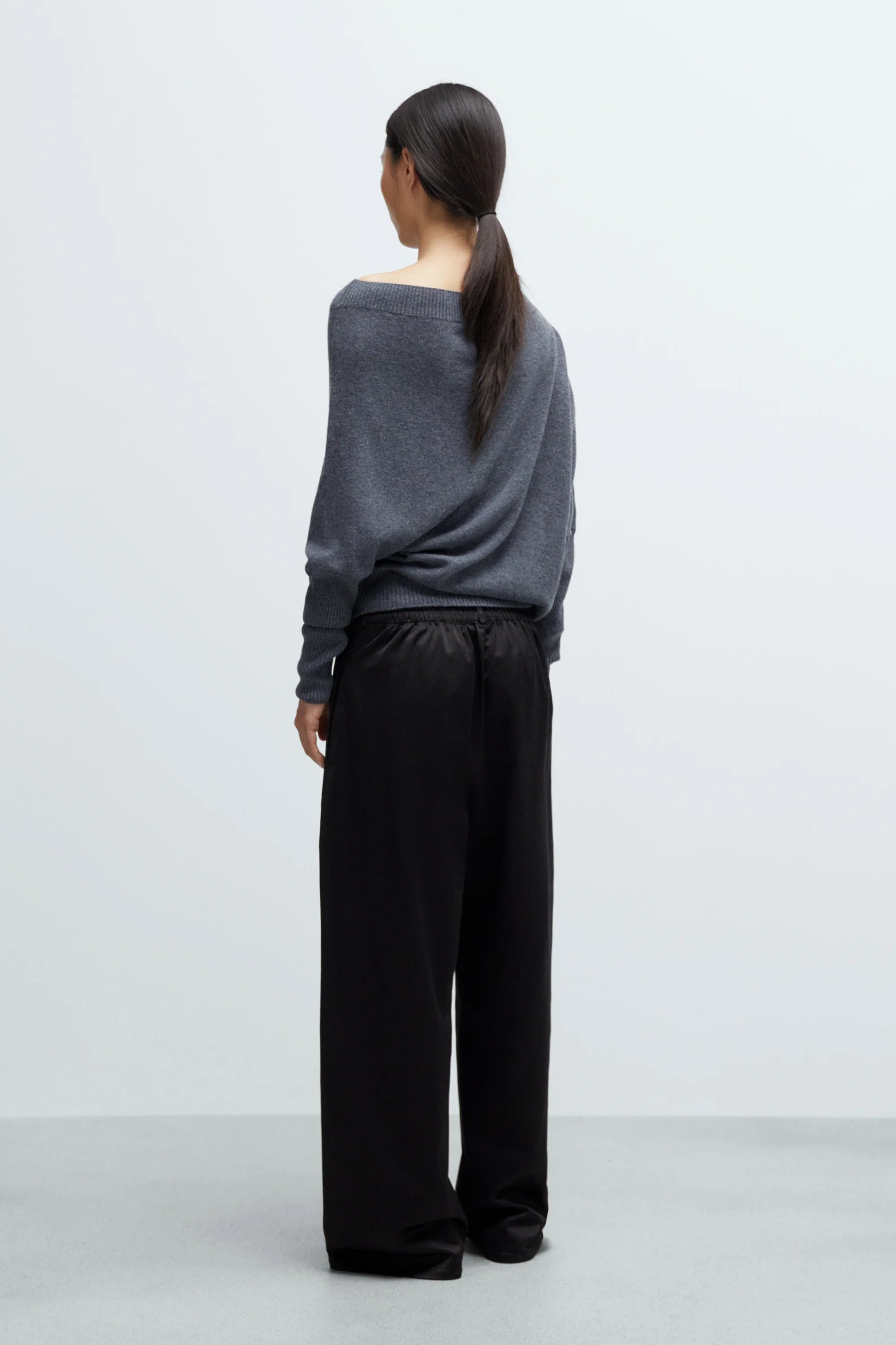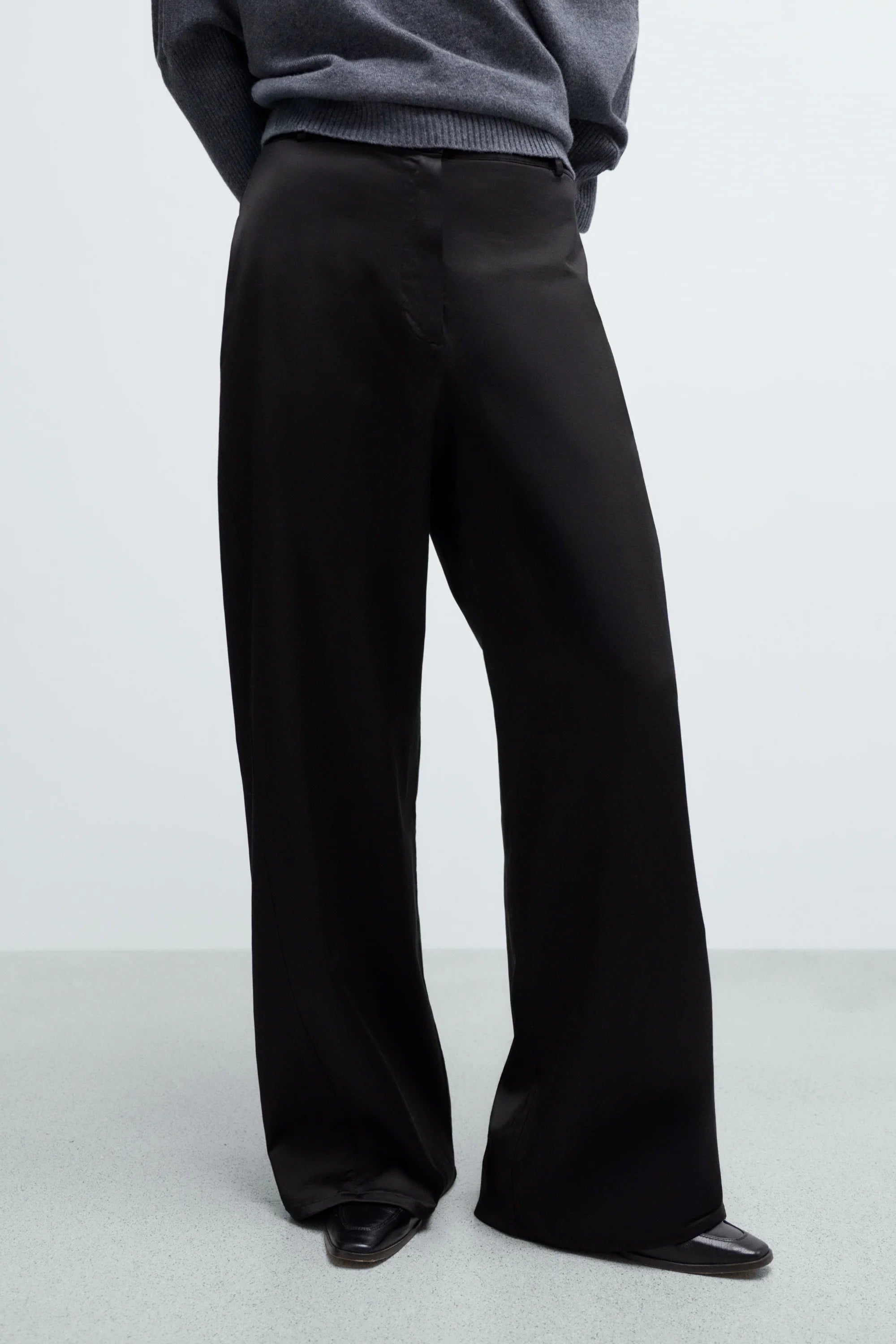 These satin straight pants from Cordera feature an oversized fit with clean, modern lines. Designed with vertical side seam pockets and no back pockets for a sleek silhouette, they include an elasticated back waistband and belt loops for comfort and versatility. Forward-positioned side seams add a subtle yet distinctive design detail. Crafted from luxurious, fluid satin fabric, they combine elegant drape with effortless ease, elevating a classic silhouette with a refined finish.
