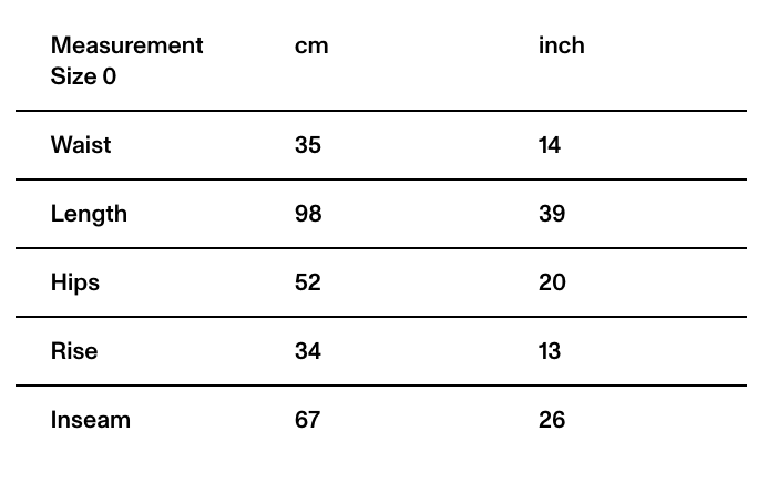Fit | Size ZERO. Size range runs as 32 EU size to 38 EU size, see measurement chart in photos for reference. Model is 178 cm tall and is wearing Size One.
