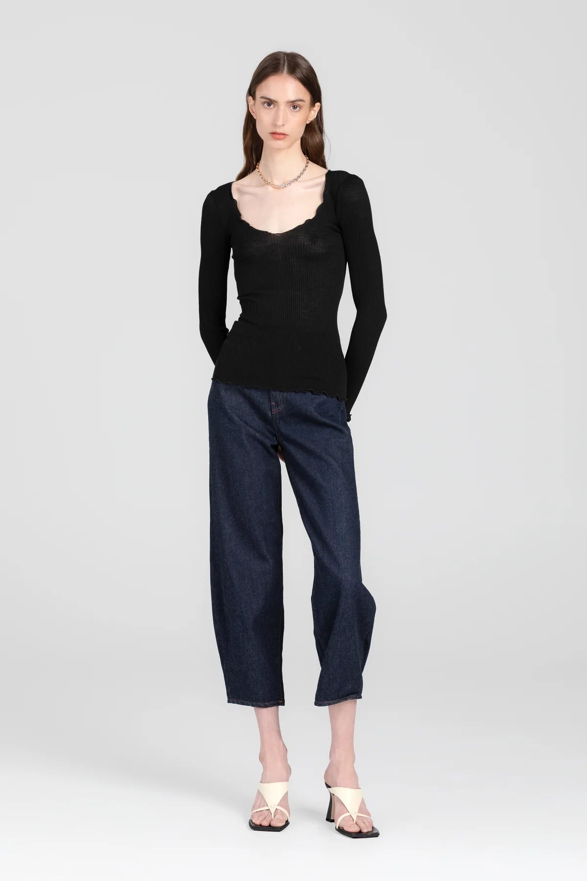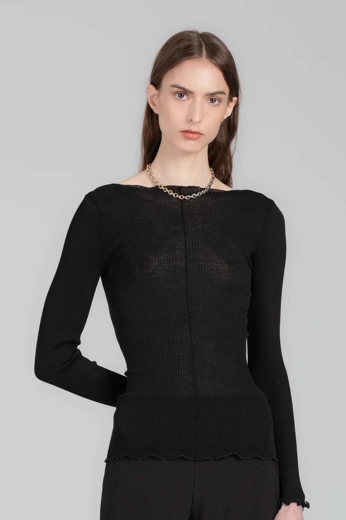 A reversible design featuring an exposed centre seam. Cut from a delicate wool and silk melange knit fabric creating an elevated basic. From the undone hem to the slightly sheer ribbed finish, the Aila top will become your go-to for everyday layering.