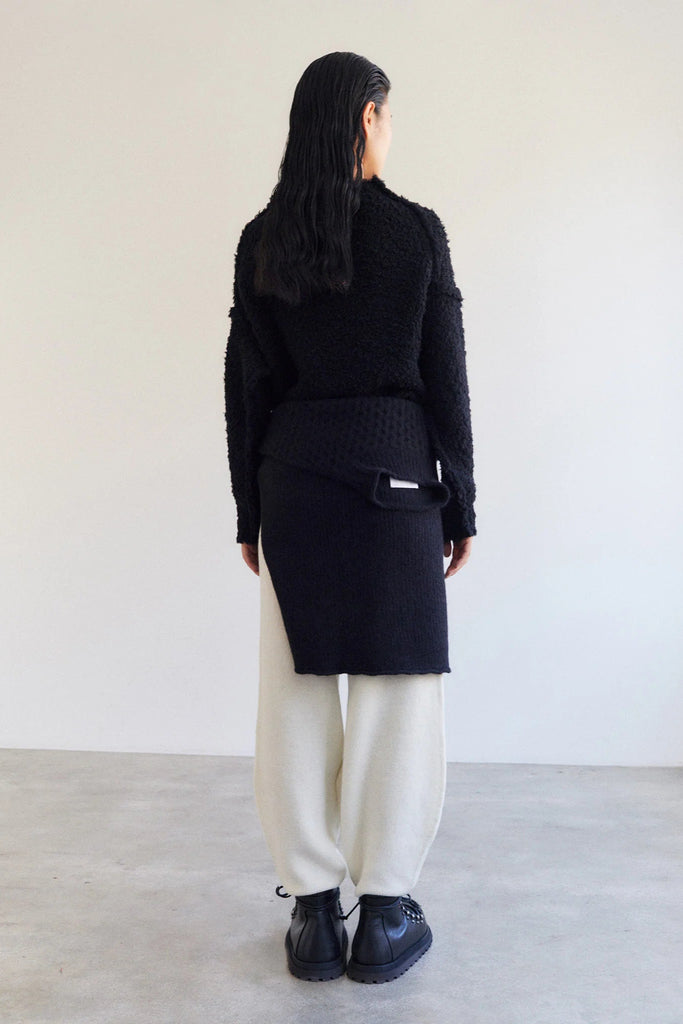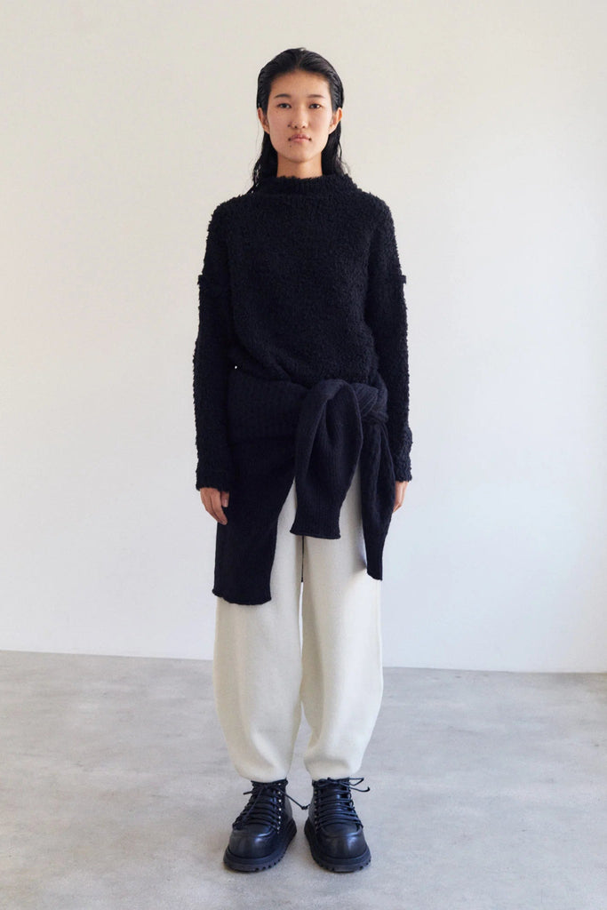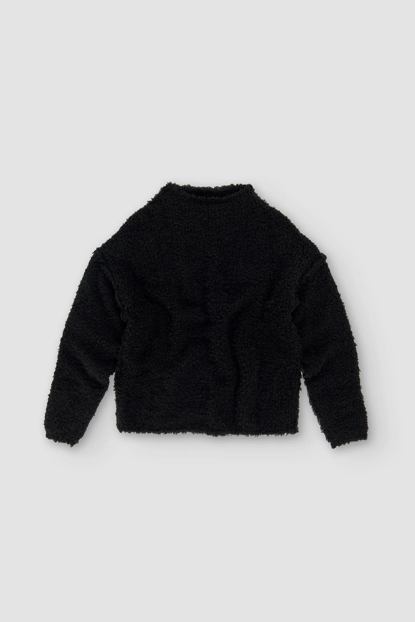 Relaxed sweater knitted from a chunky, textured wool blend. It features exposed seams, dropped shoulders, an integral mock neck, and ribbed cuffs and hem.