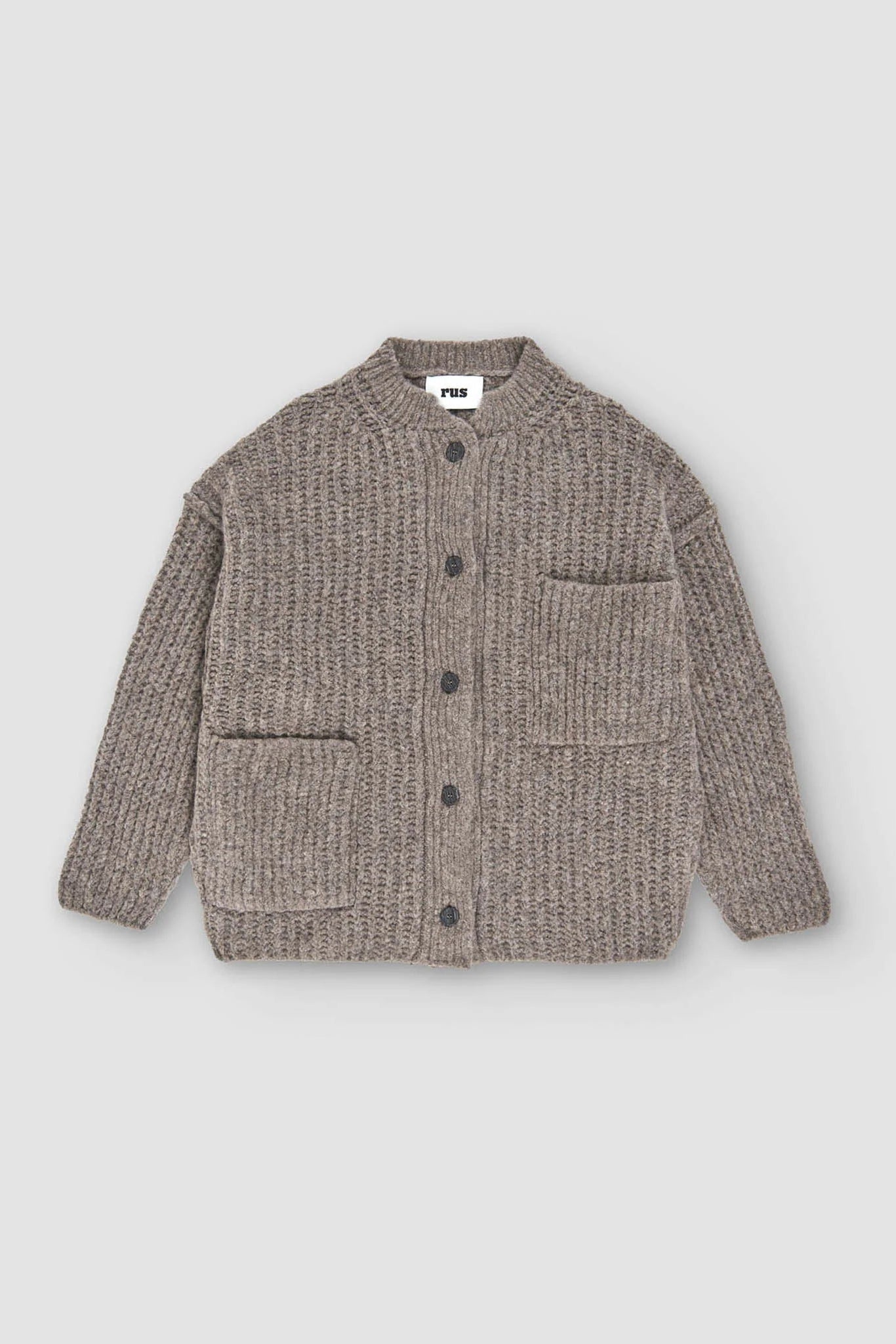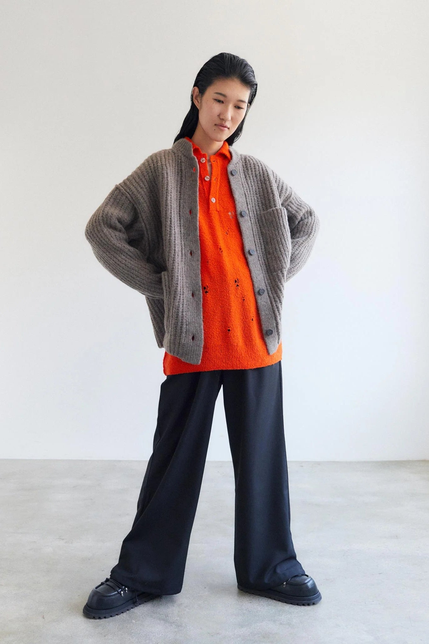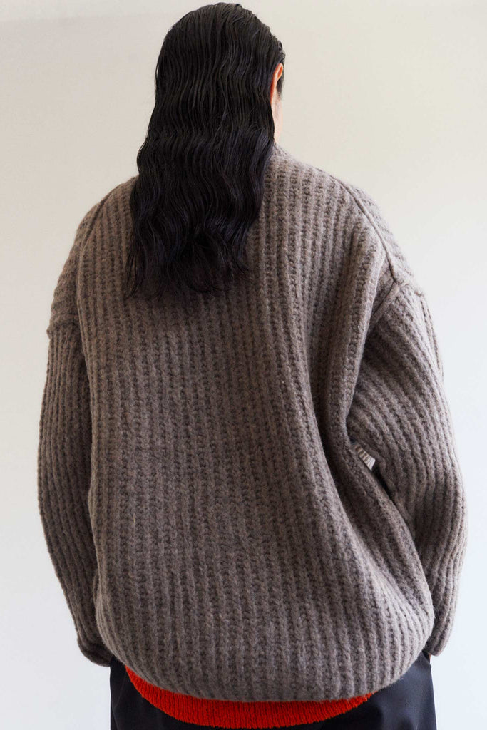 Relaxed ribbed cardigan knitted from felted extrafine merino wool featuring two positional pockets. Designed for a boxy fit, with exposed seams, front button closure and dropped shoulders.