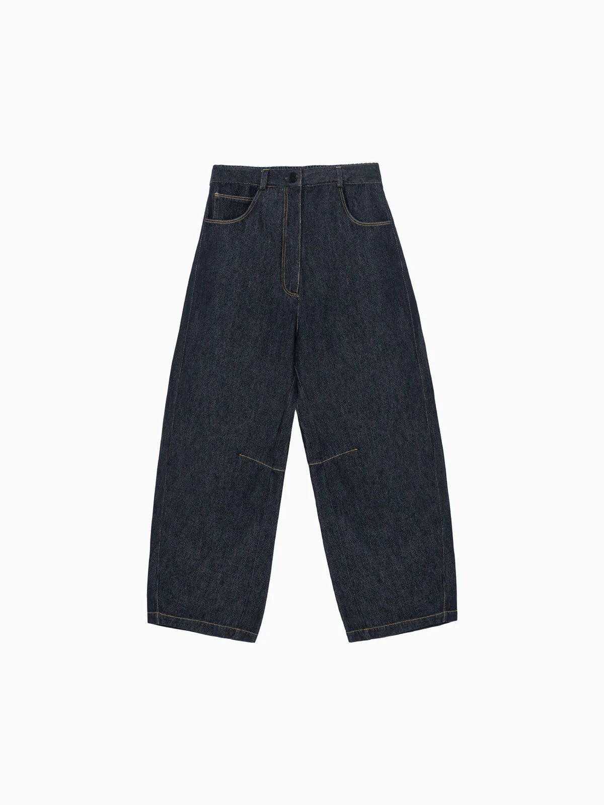 These curved baggy jeans from Cordera feature a dark denim wash with contrasting stitching for a classic yet distinctive look. Designed with an oversized fit and low rise, they offer relaxed comfort and style. The traditional five-pocket design includes three front and two back pockets, complemented by belt loops for versatility. A unique internal knee seam adds subtle detail. Made from soft, substantial cotton fabric, these jeans provide ease of movement with a comfortable, non-rigid feel.