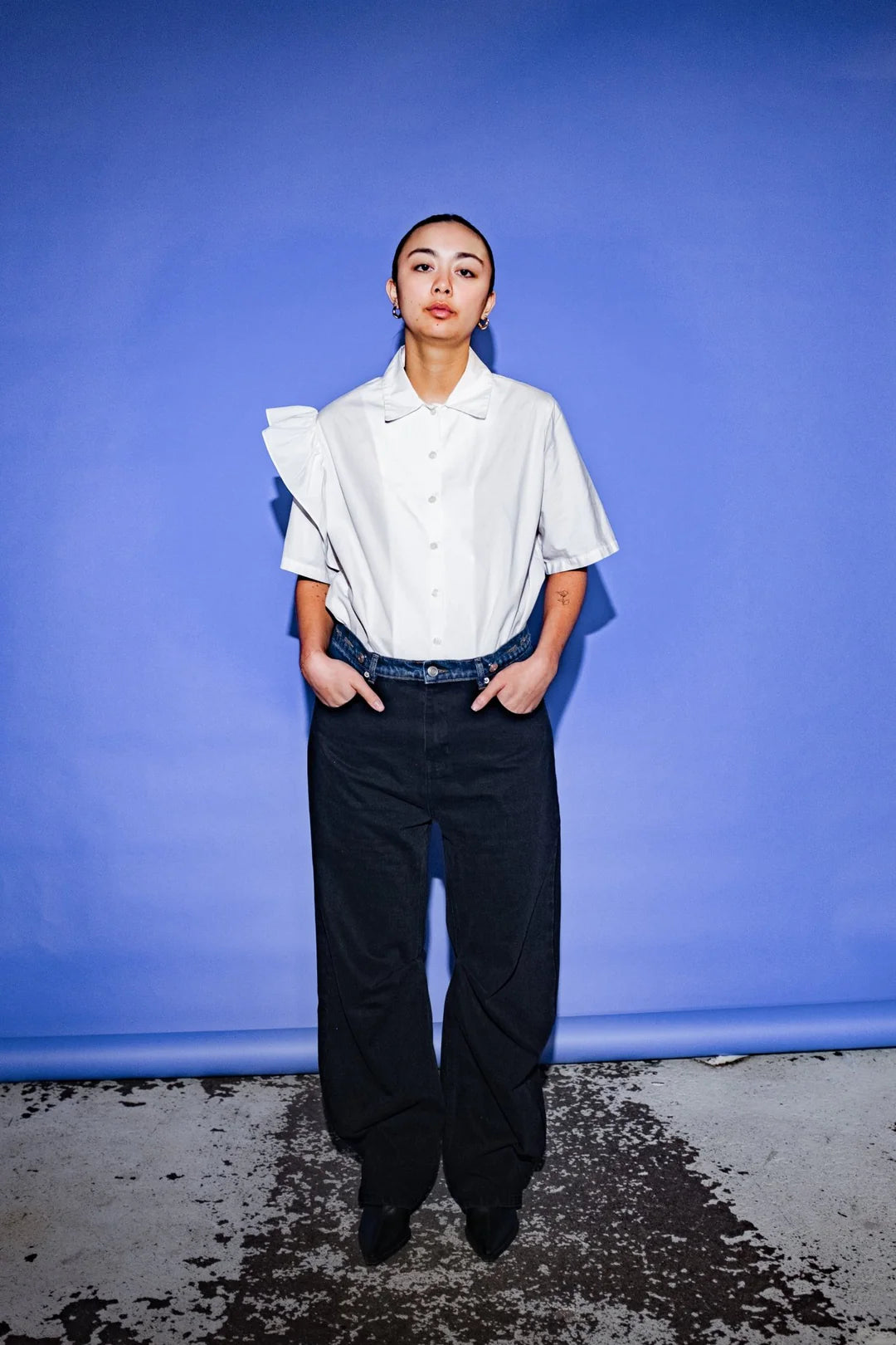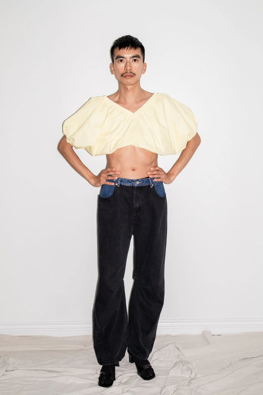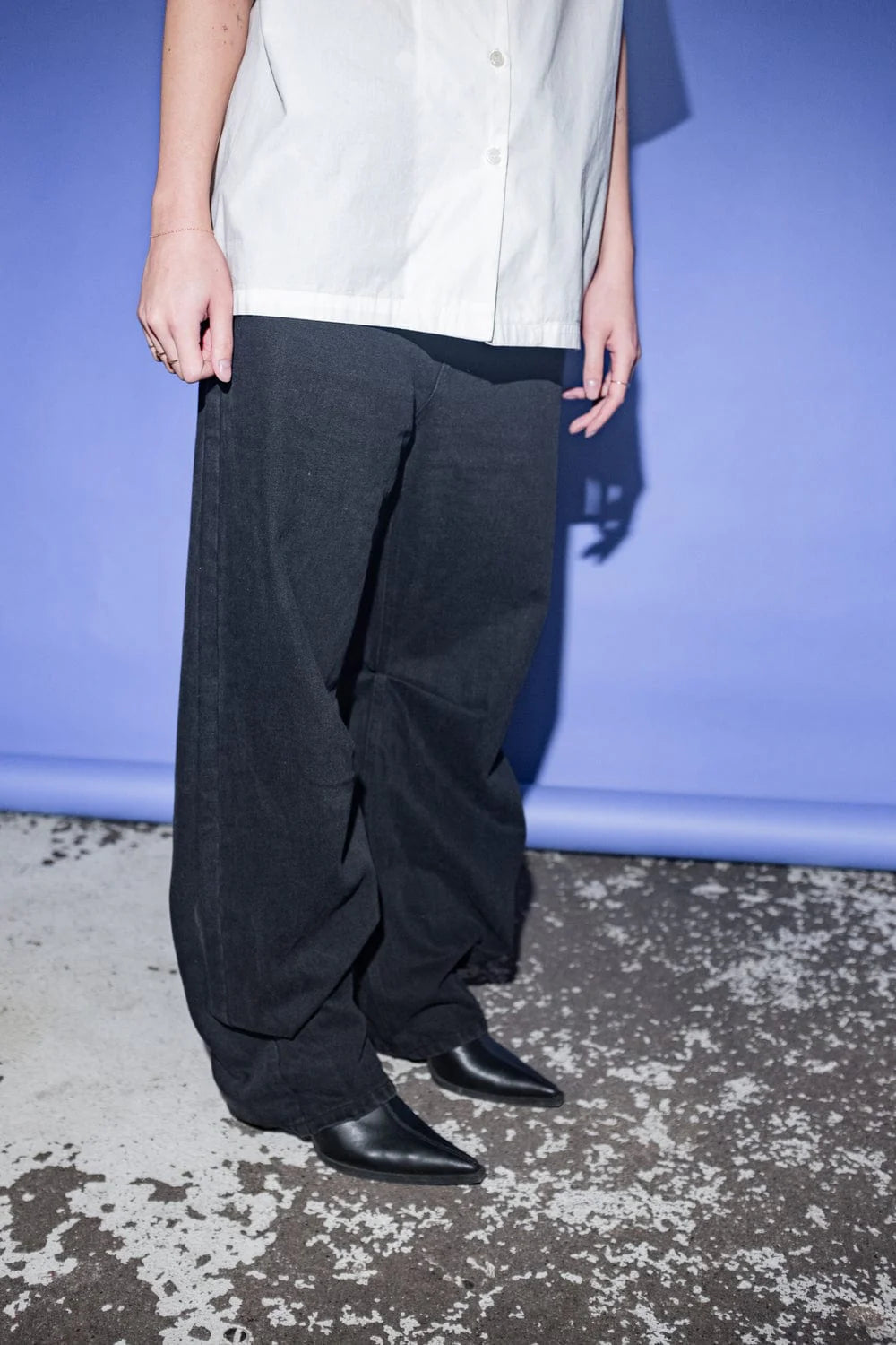 Et Tigre's best-selling pant. These black, wide-leg denim pants with dark wash waistband detail and dart detailing at the knees. The waist is adjustable with buttons on each side, so you can wear these jeans on low on your hips or higher-waisted.