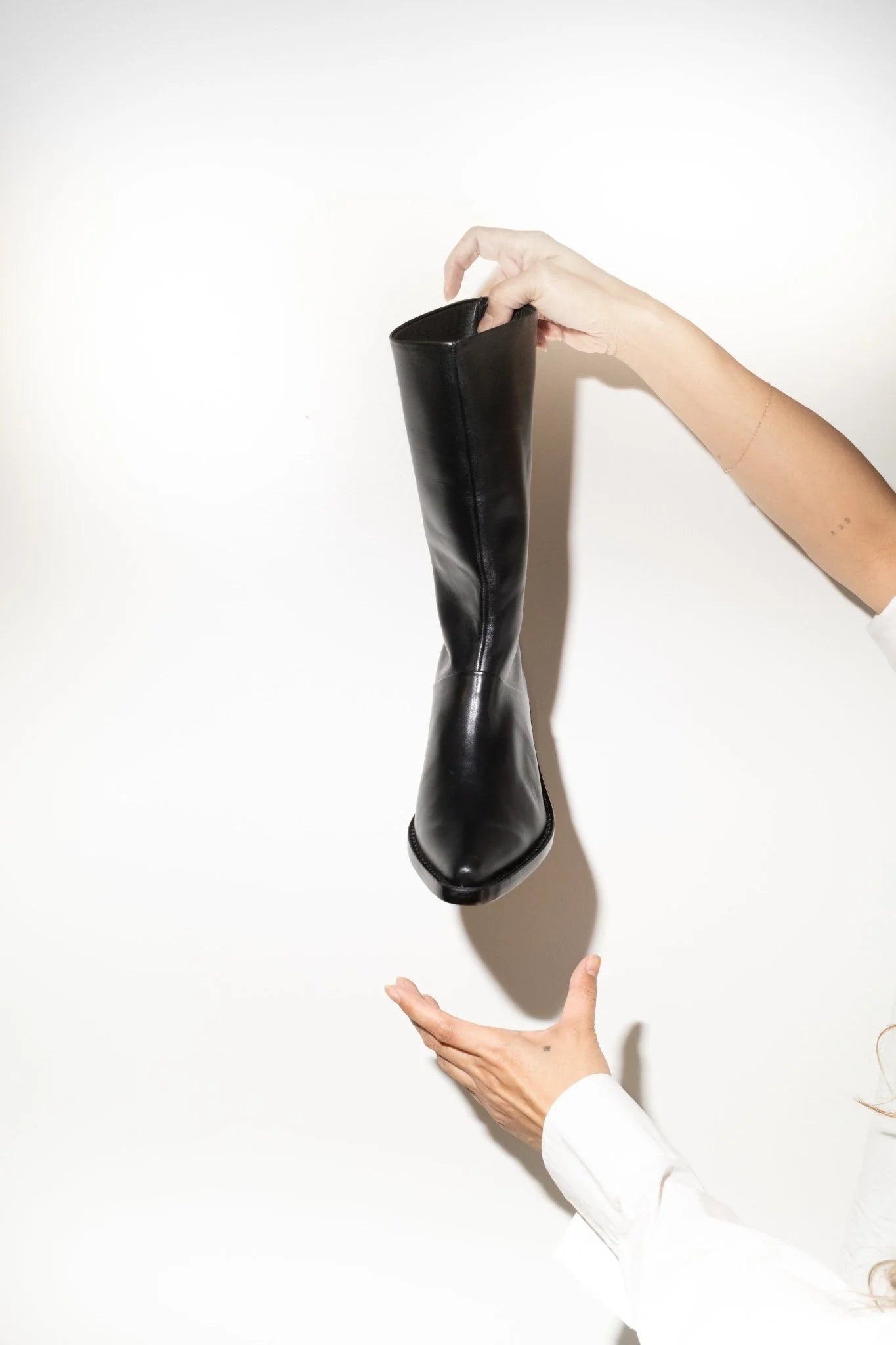 The Jackie Boot from Et Tigre is made in a black nappa leather with a black wooden heel. Features an almond-toe design with a 1" heel height.