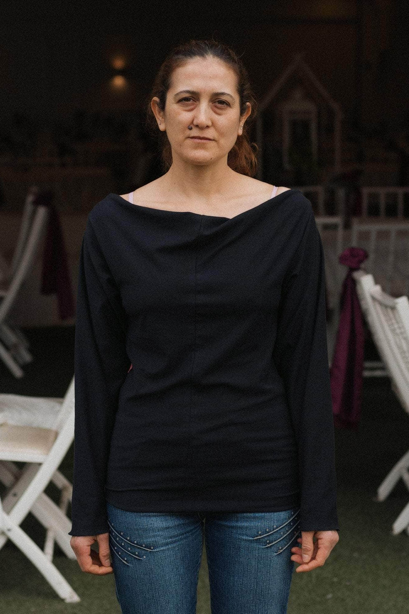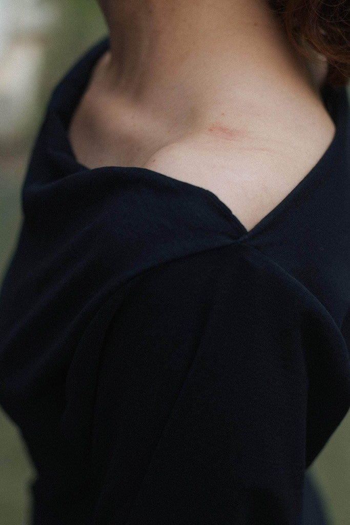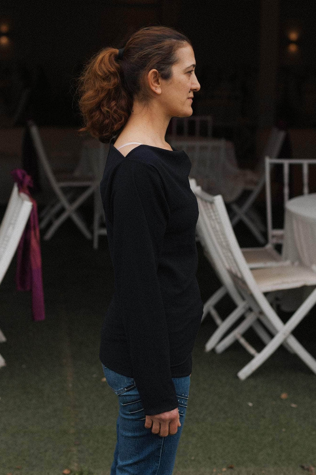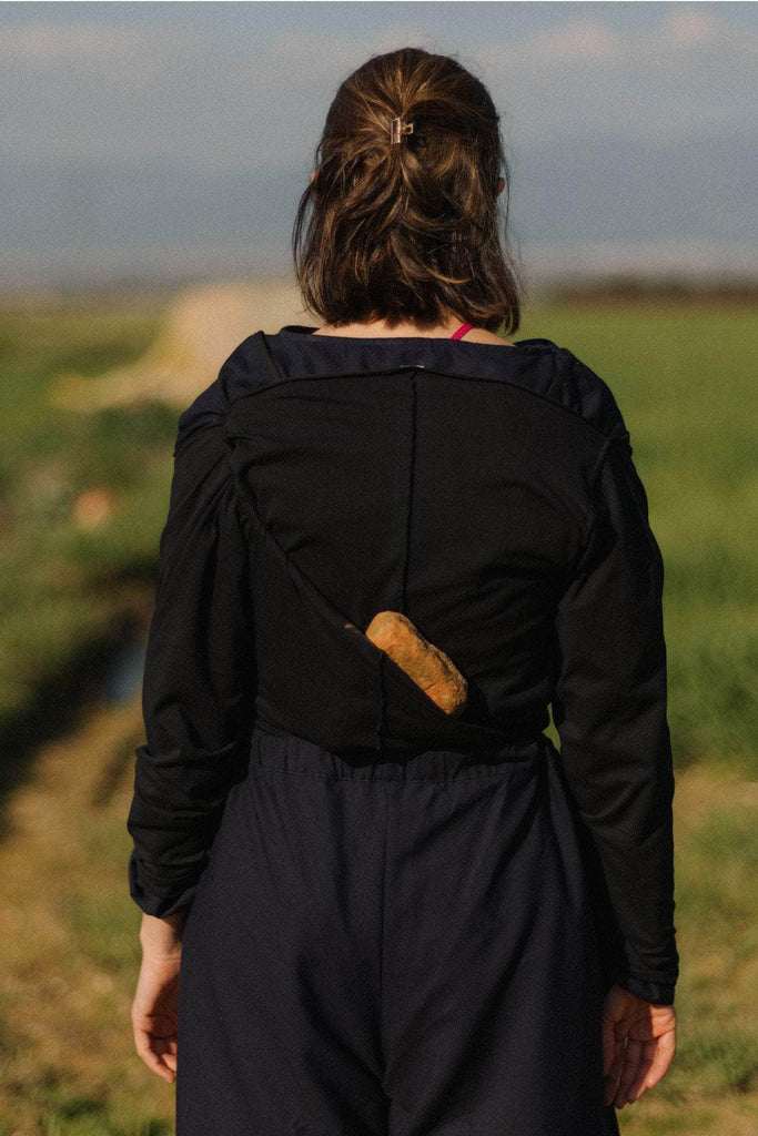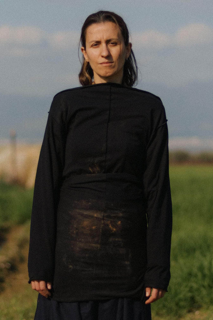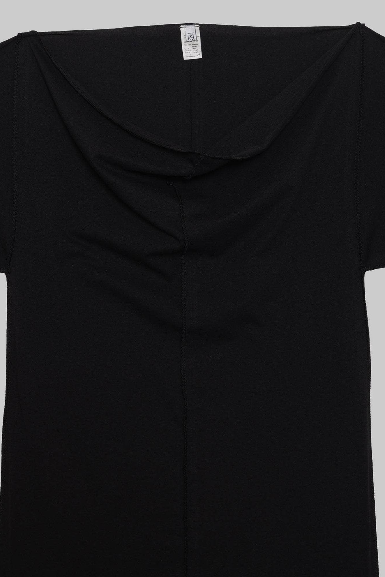 A cowl neck long sleeve tee from Baserange. Features exposed seams and cut in a regenerative and recycled cotton blend.