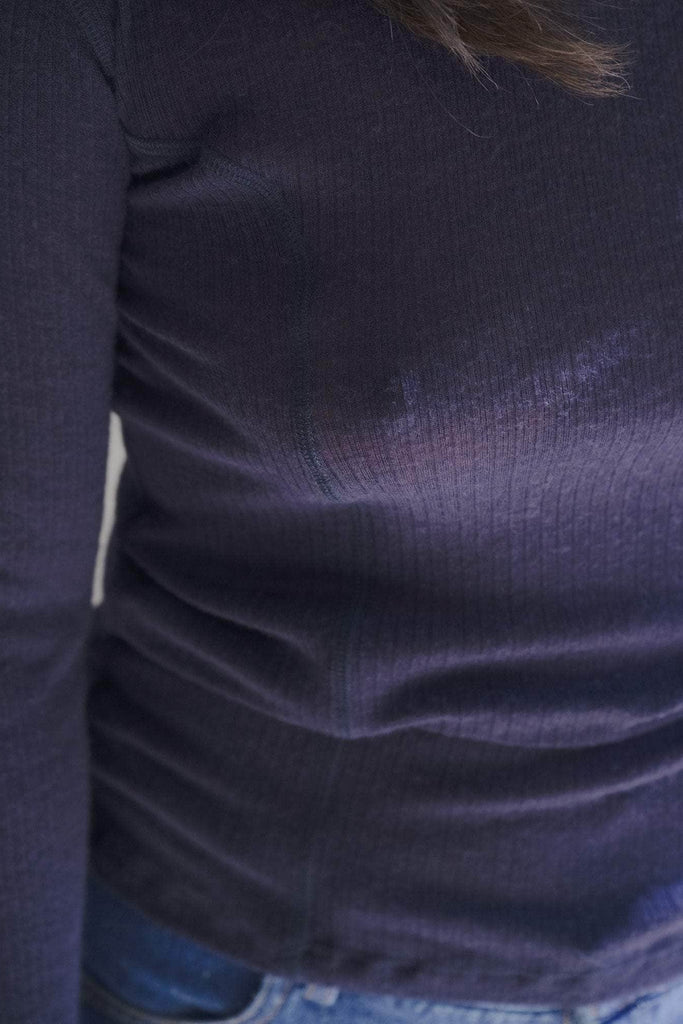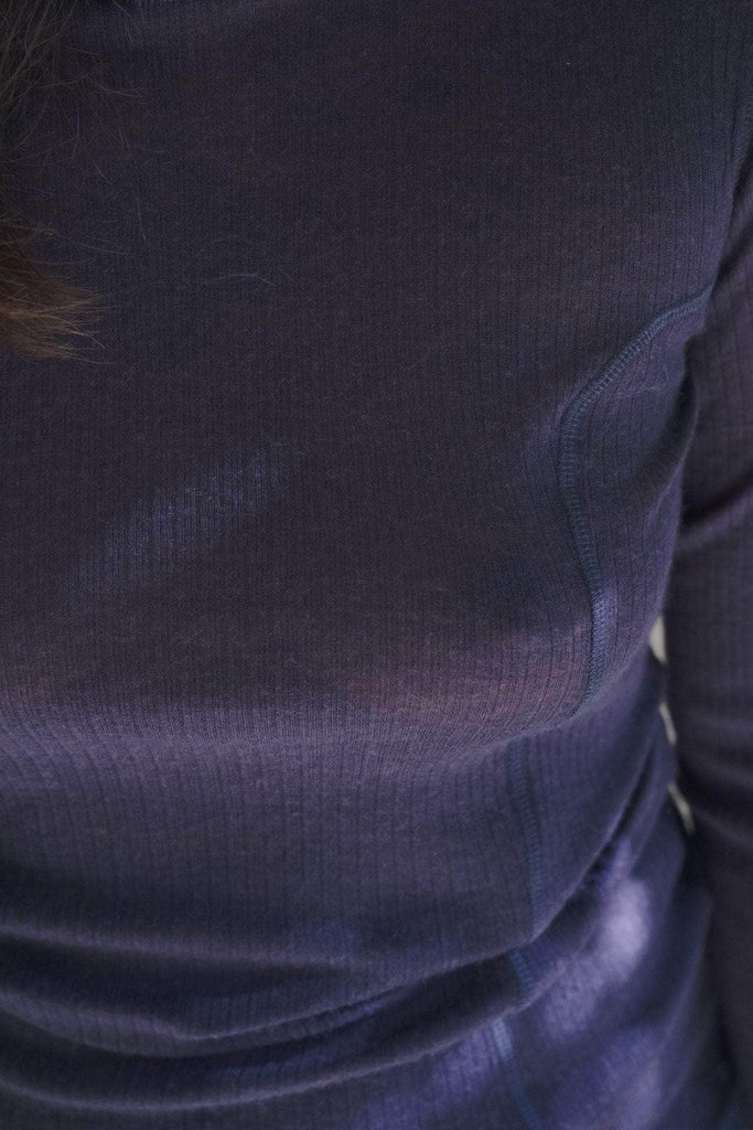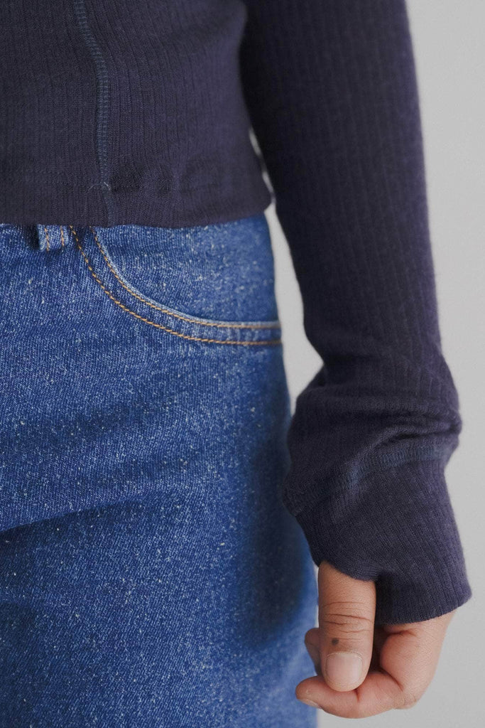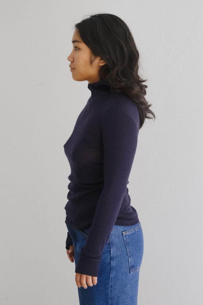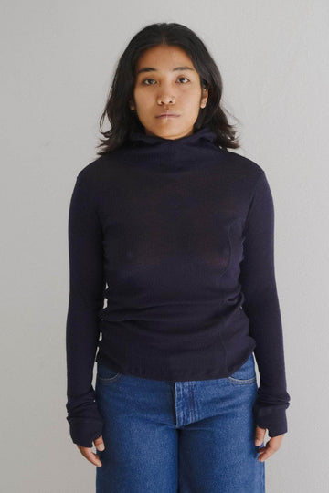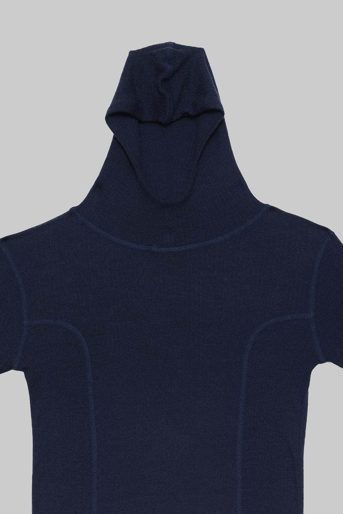 A fine, wool rib hoodie from Baserange. Features a high neck with a hooded back and thumbholes at the wrist.