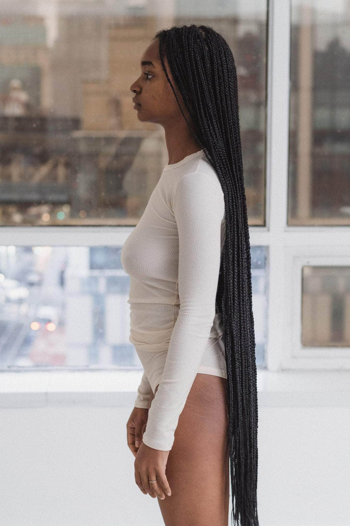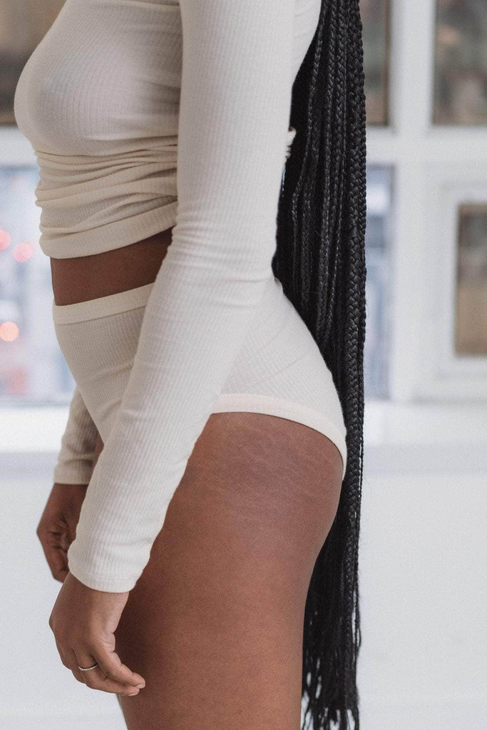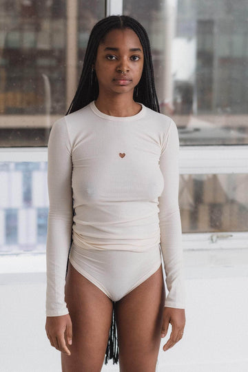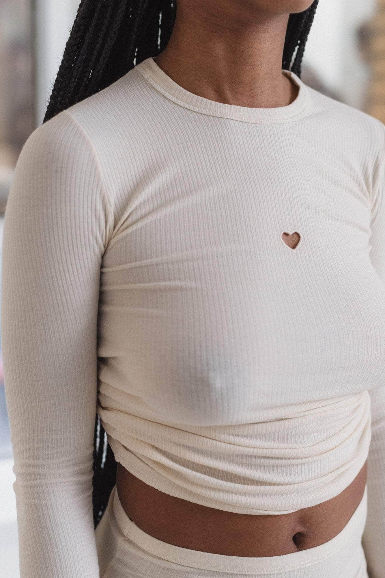 Organic cotton rib crewneck longsleeve tee from Baserange. Features a heart cut out detail at front. Undyed fabric.