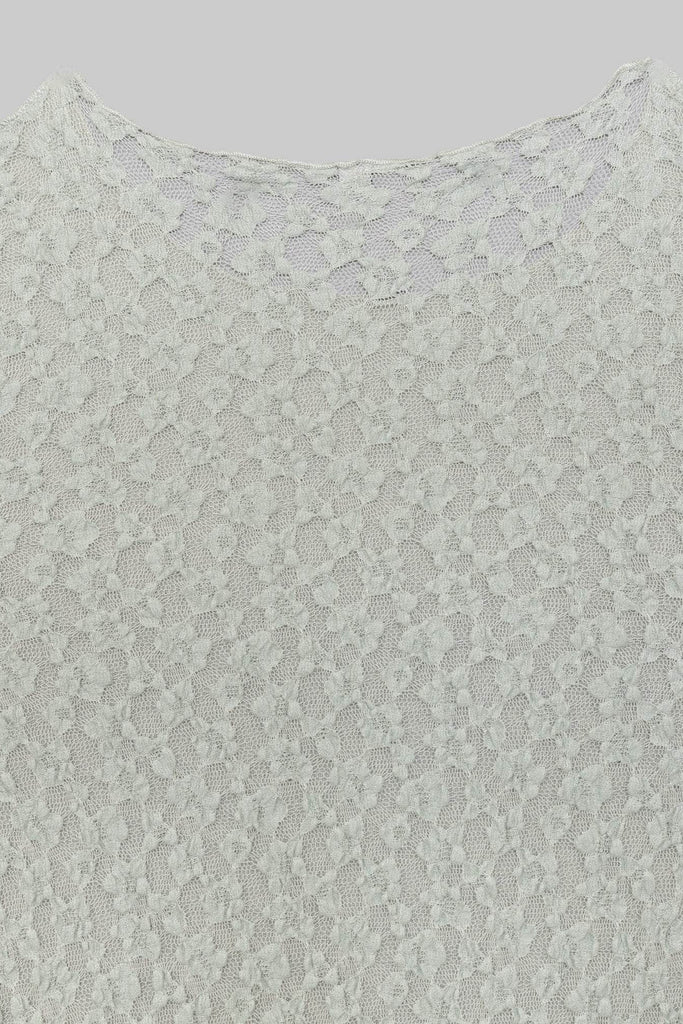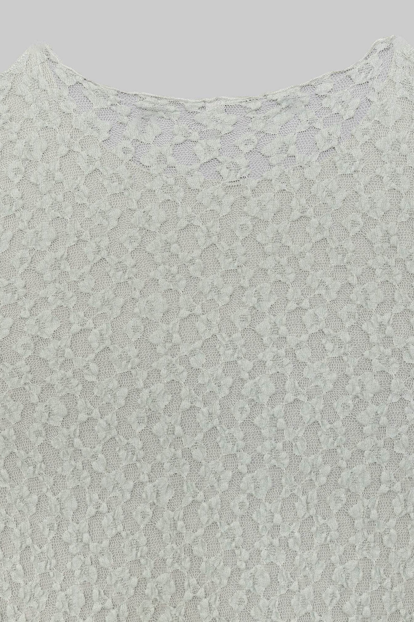 A fine, soft wool rib long sleeve tee from Baserange. Features a boat neckline, exposed seams and lace detail at back. Lettuce edge at hems and neckline.