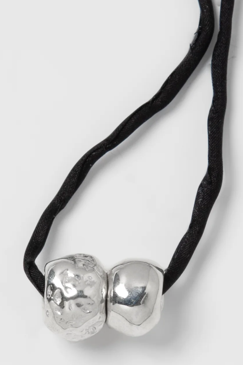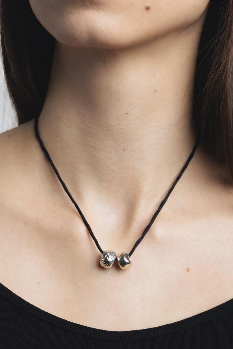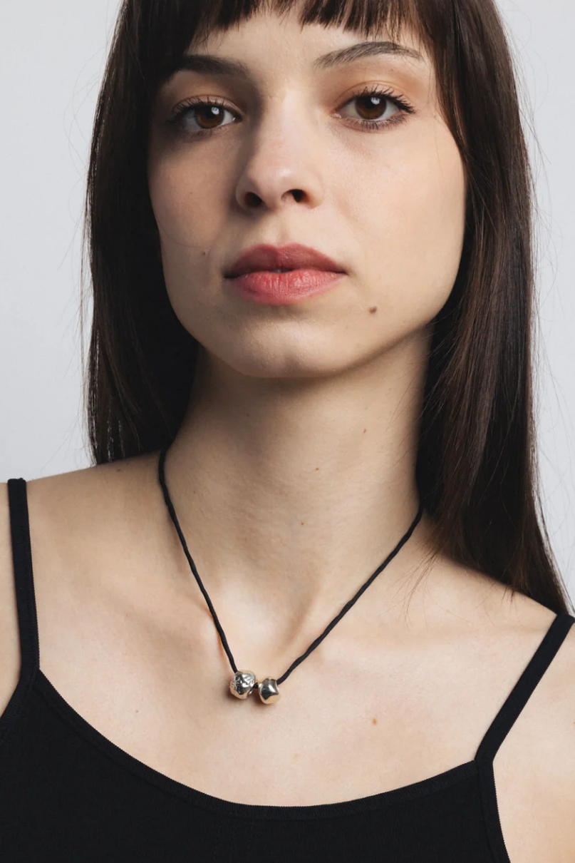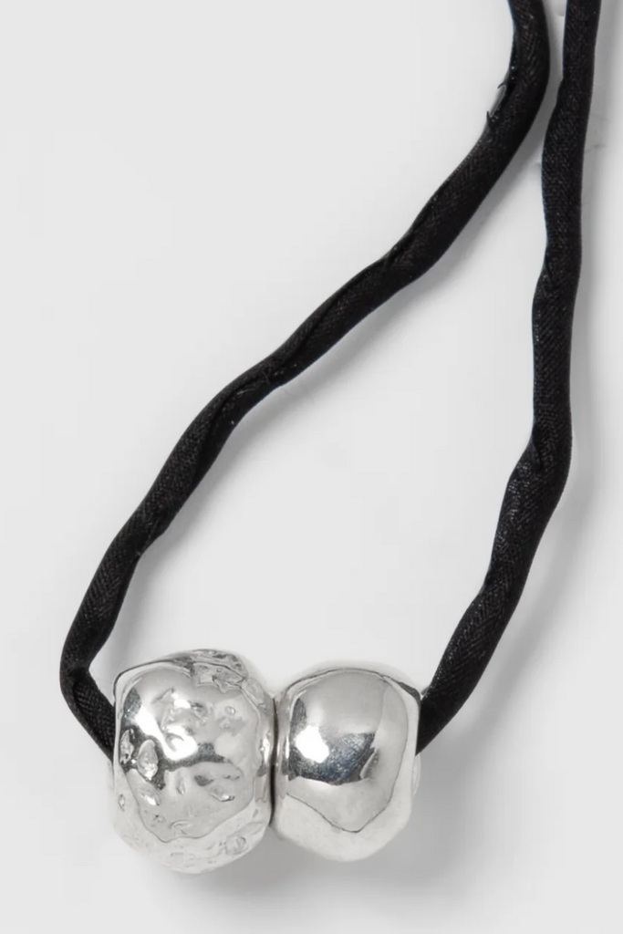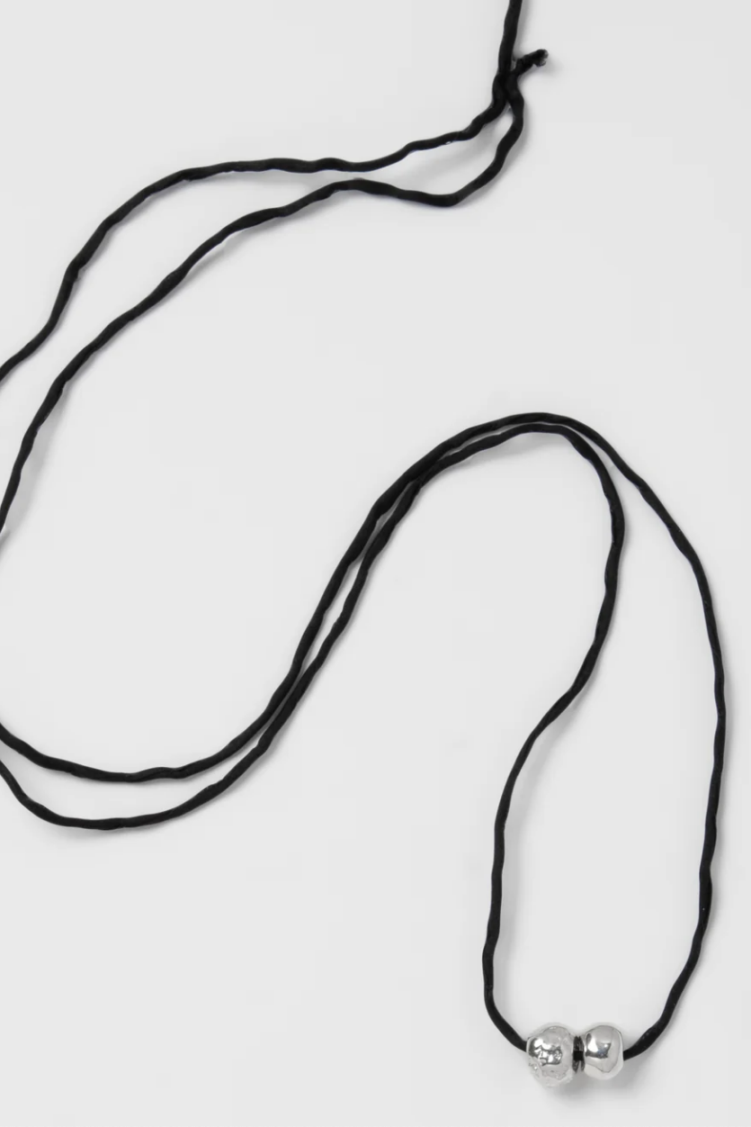 A silk cord necklace with two silver plated recycled brass beads. Measures 40" in length.
