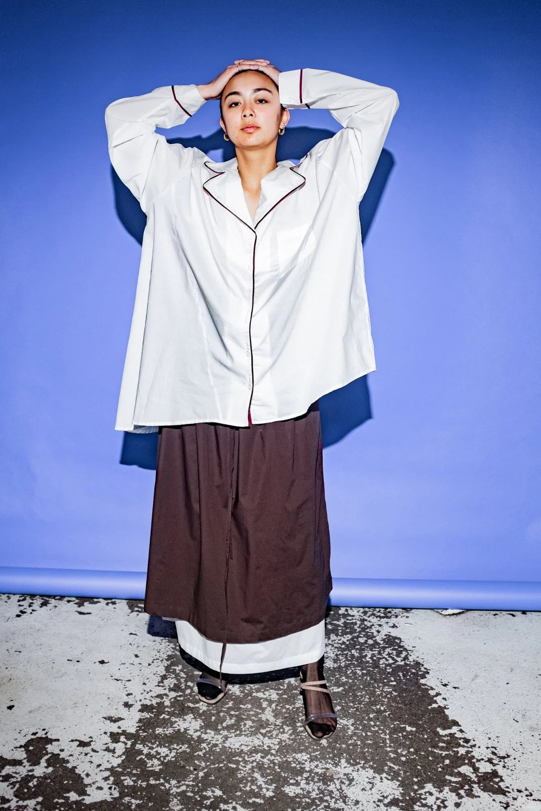 Long sleeve button up shirt from Et Tigre with pajama style collar and asymmetrical hem.