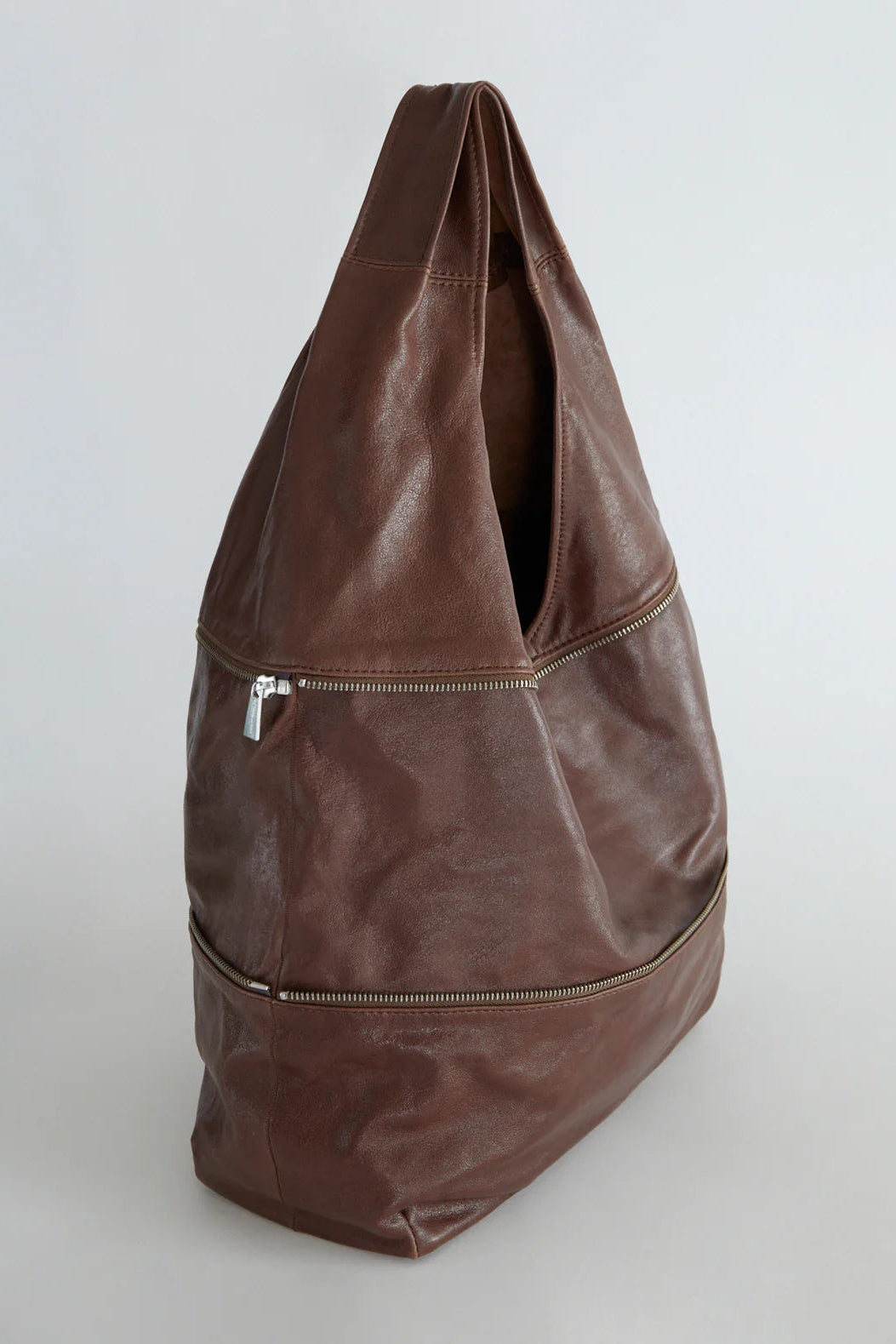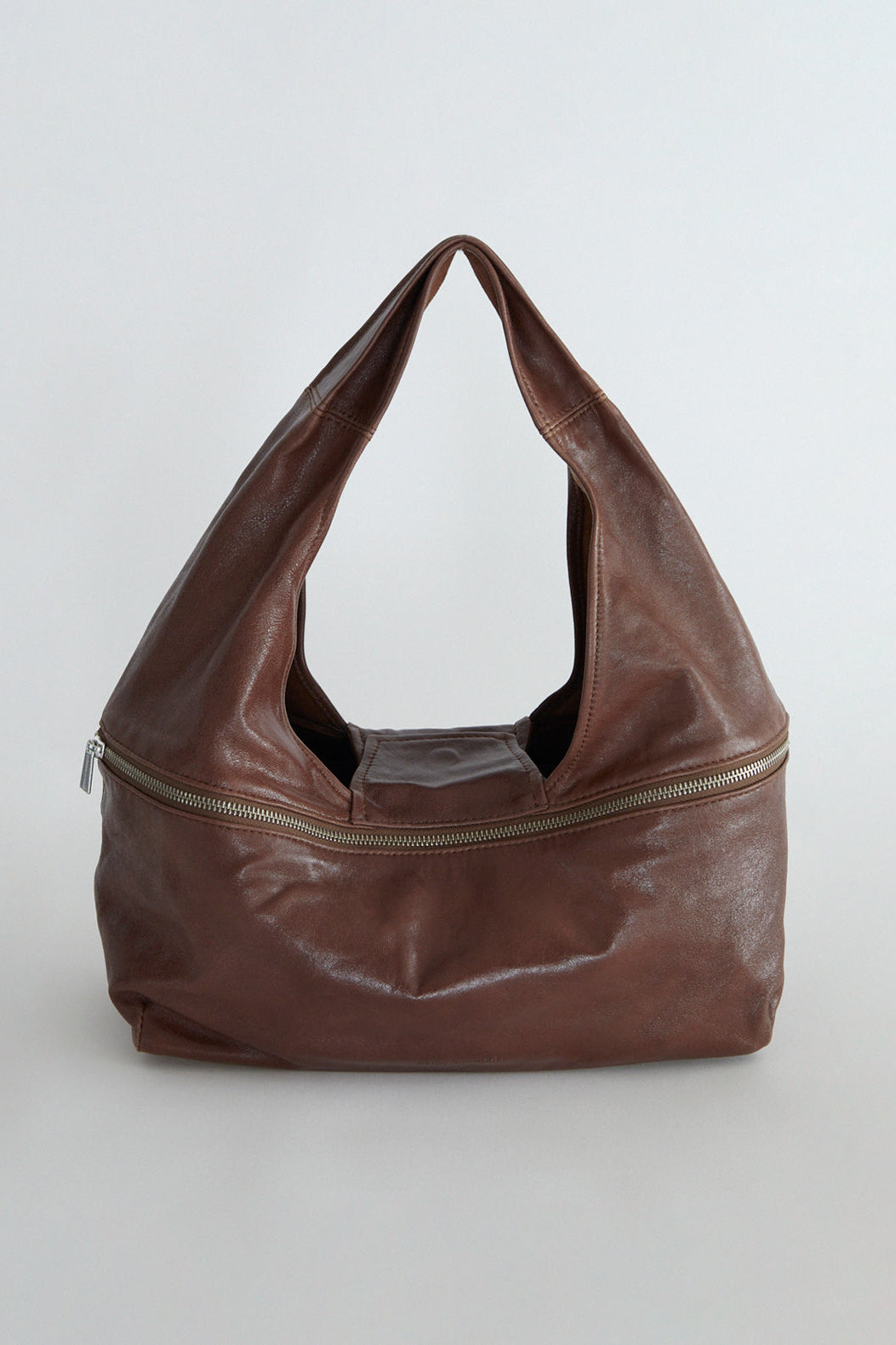 Bucket-style shoulder bag, unlined with an interior leather pocket. It can be converted into a smaller handbag by closing the visible zipper.