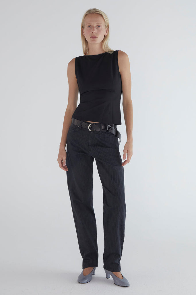 Fitted sleeveless top with back zipper that can be closed up to the waist. Made of suit fabric.
