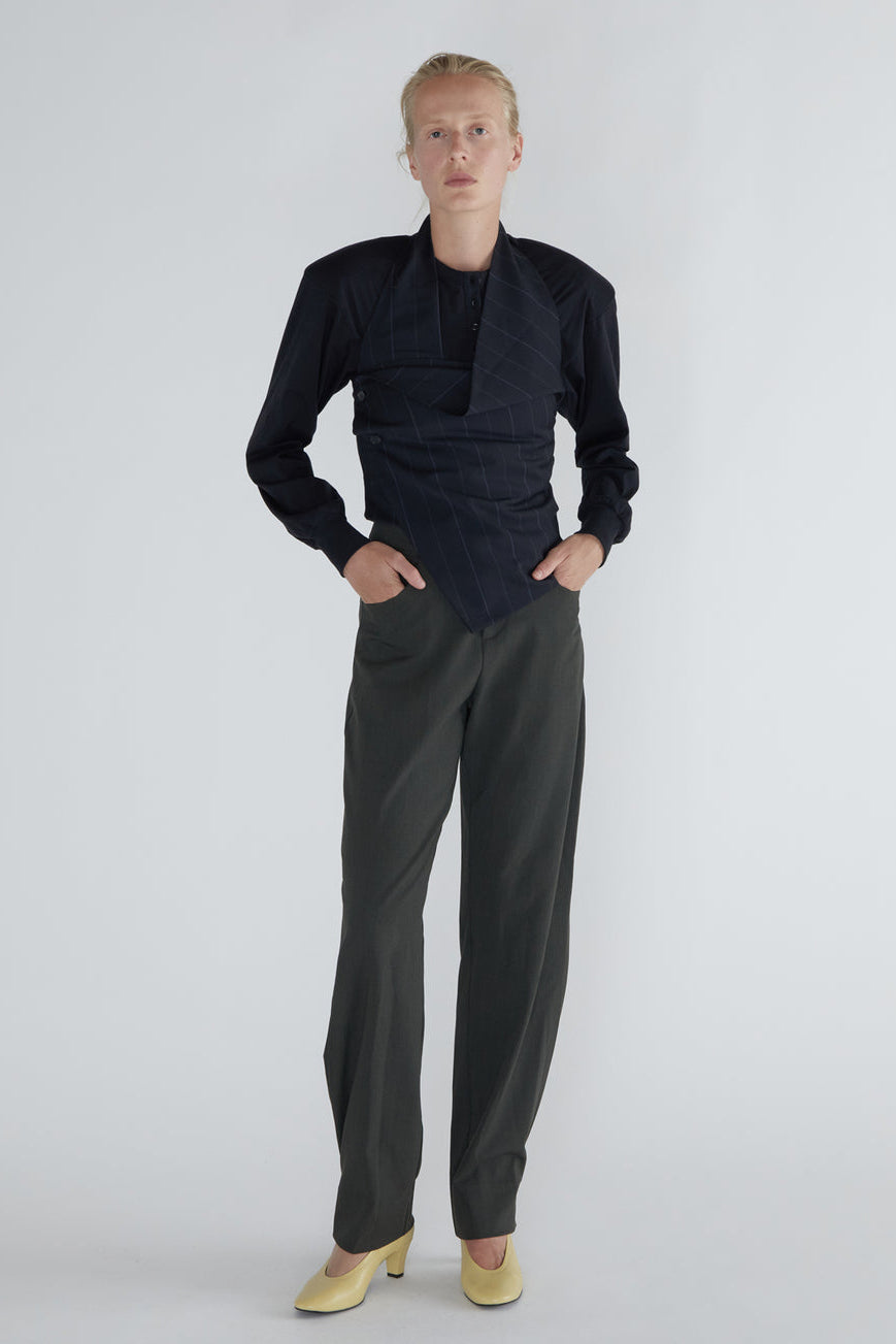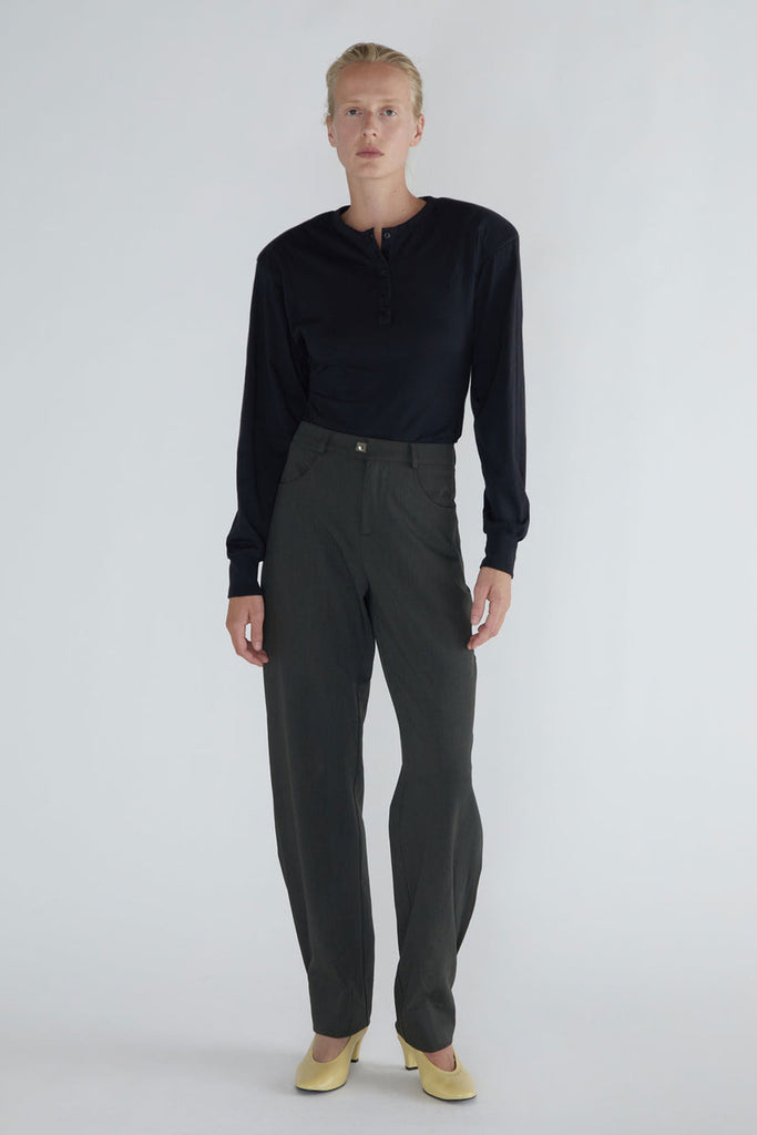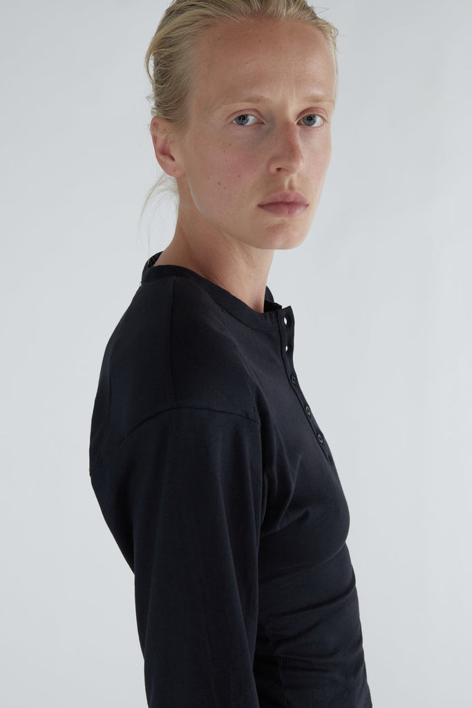 Long-sleeve top with a henley neckline, raglan sleeves, and removable shoulder pads. Made from soft, lightweight cotton. Fitted through the body with volume in the sleeves. Shoulder pads can be taken out for washing or to adjust the look.