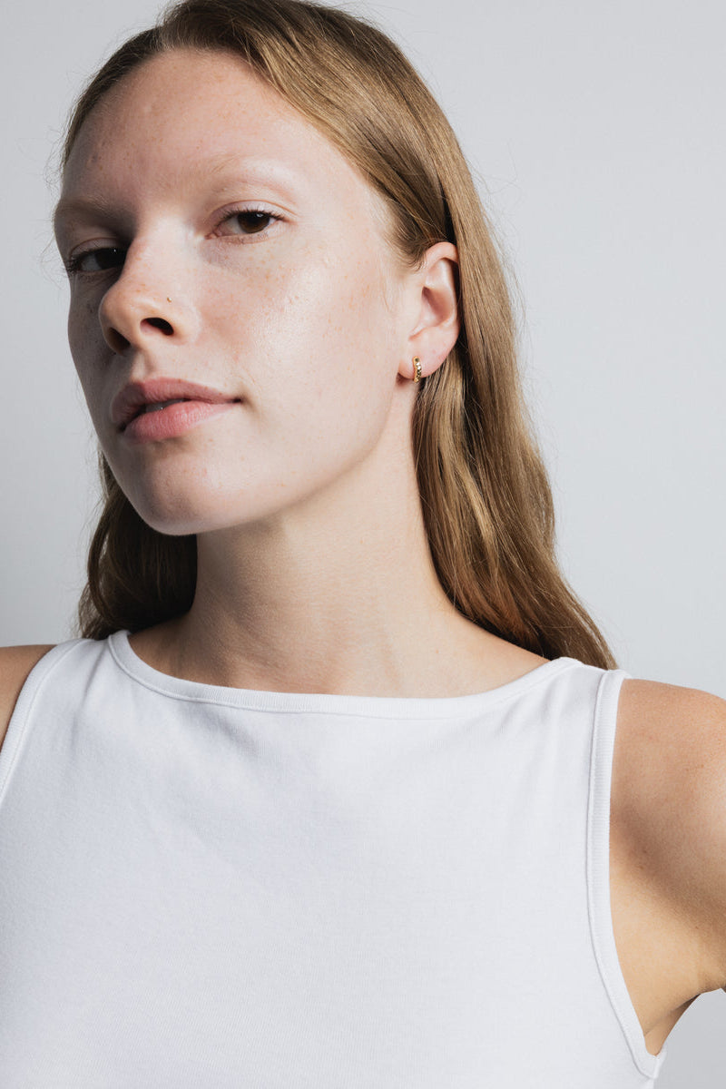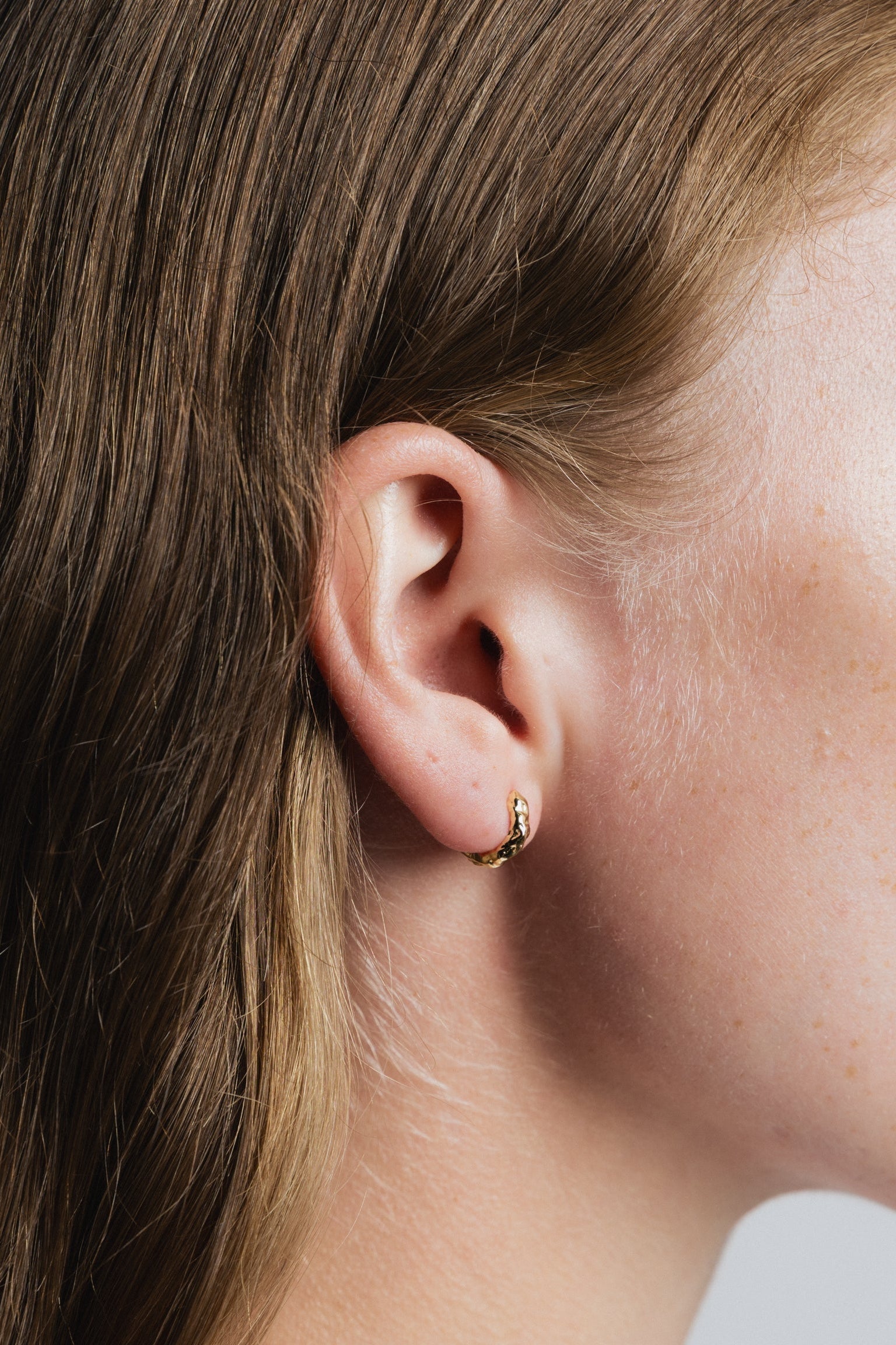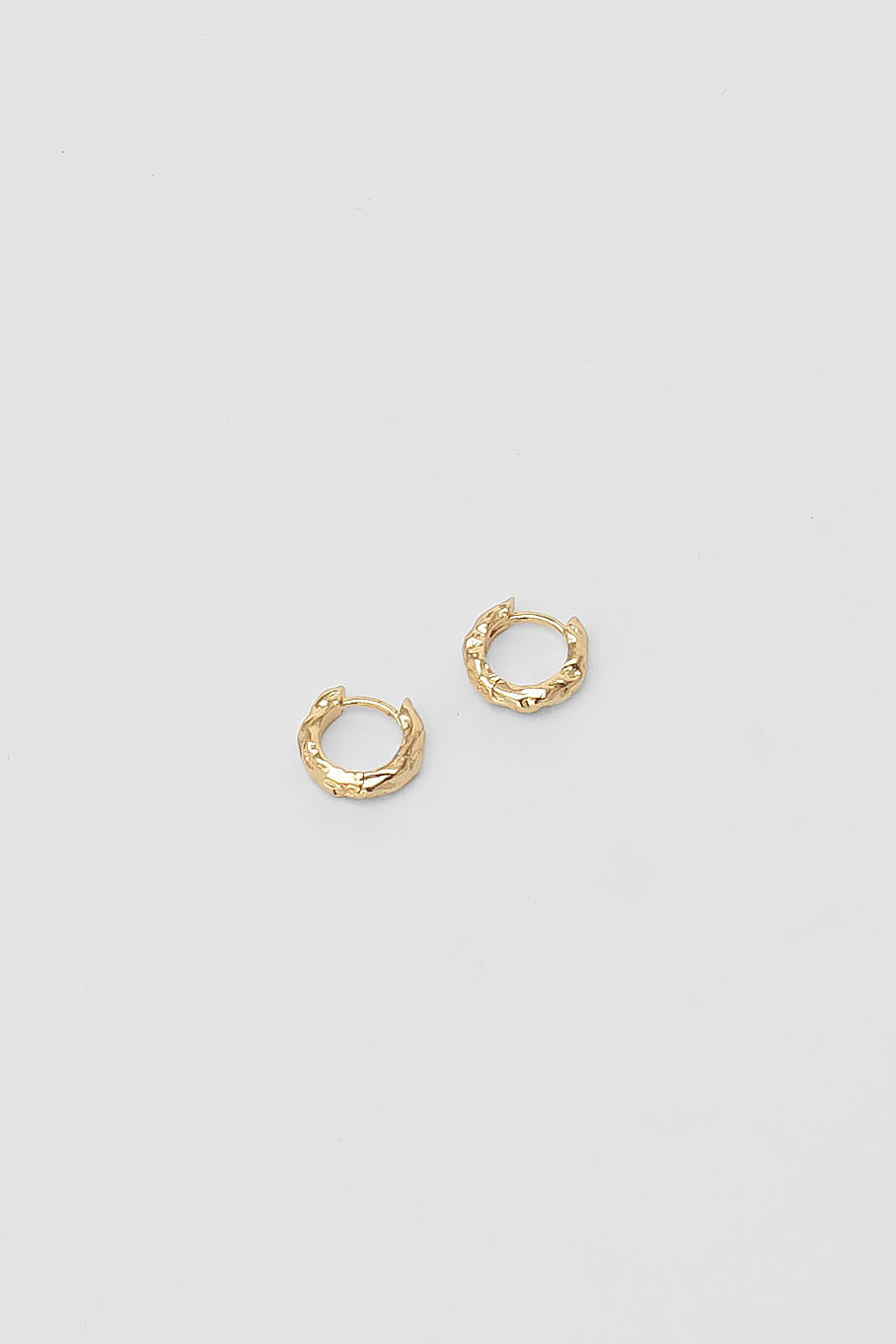 A pair of textured huggie hoop everyday earrings, made from 14K gold plated recycled brass. Inner diameter measures 7mm.
