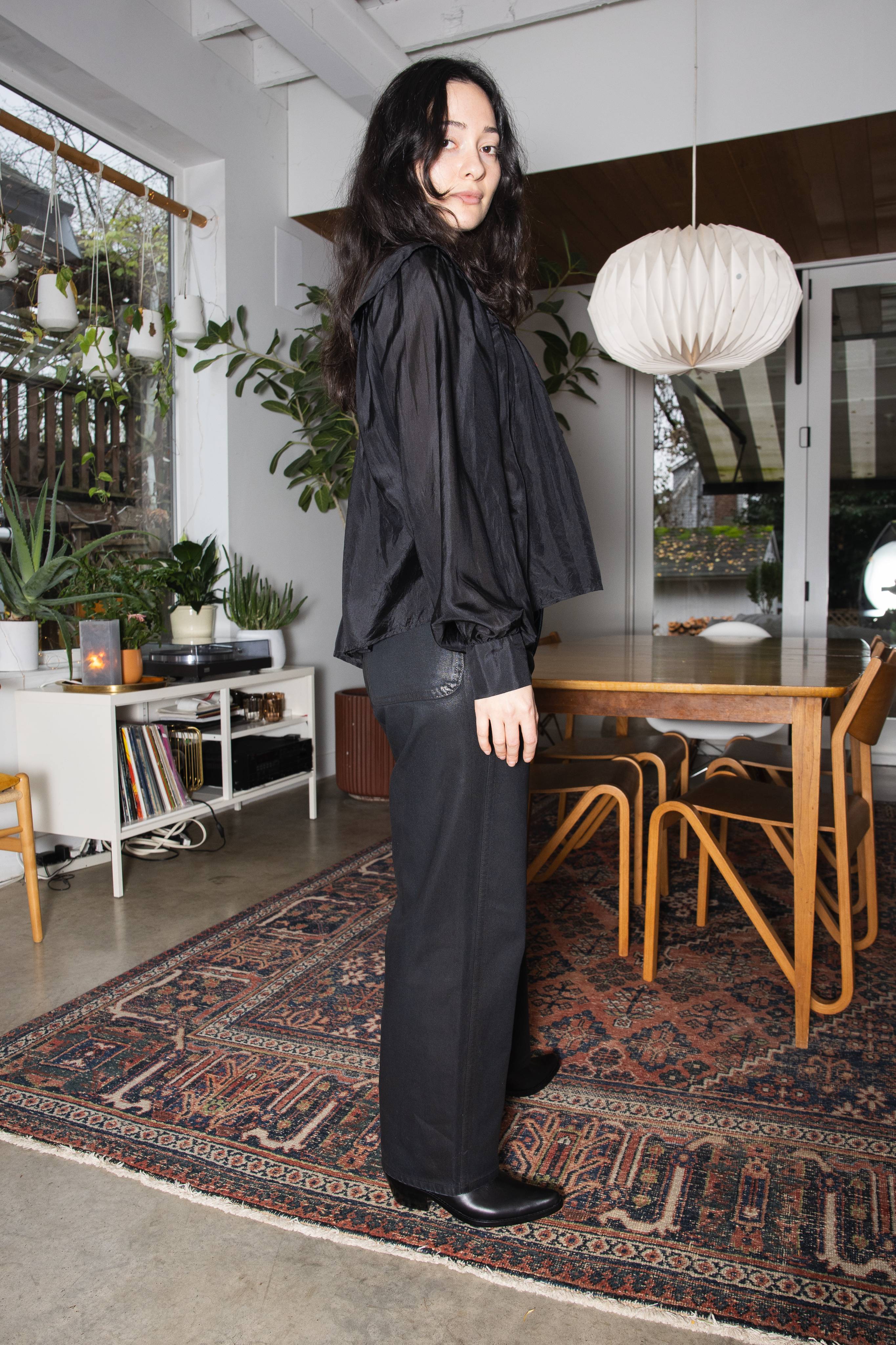 A voluminous long sleeve blouse from SC103 with neck button closure and decorative sequin details at chest. Button cuffs.